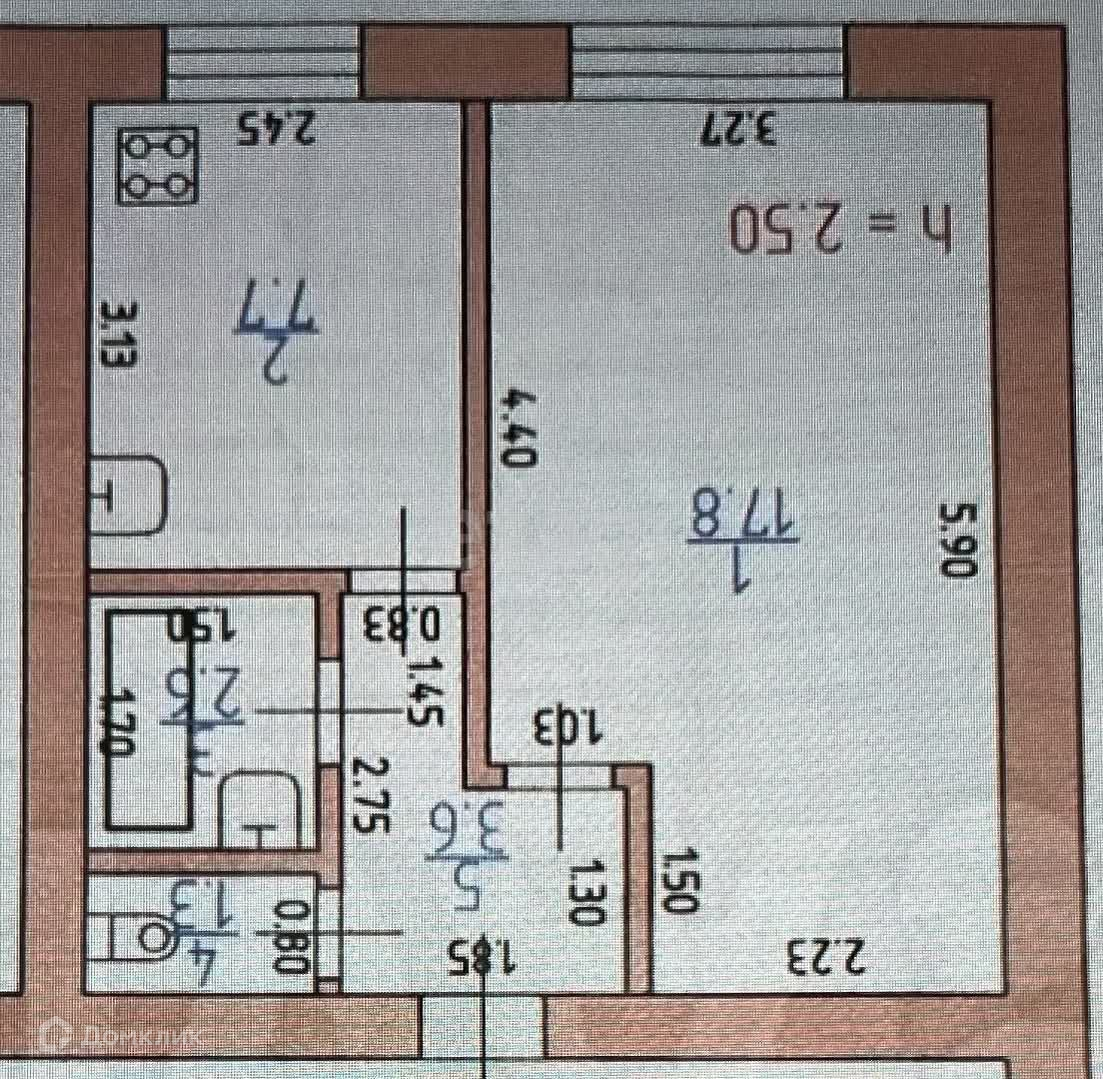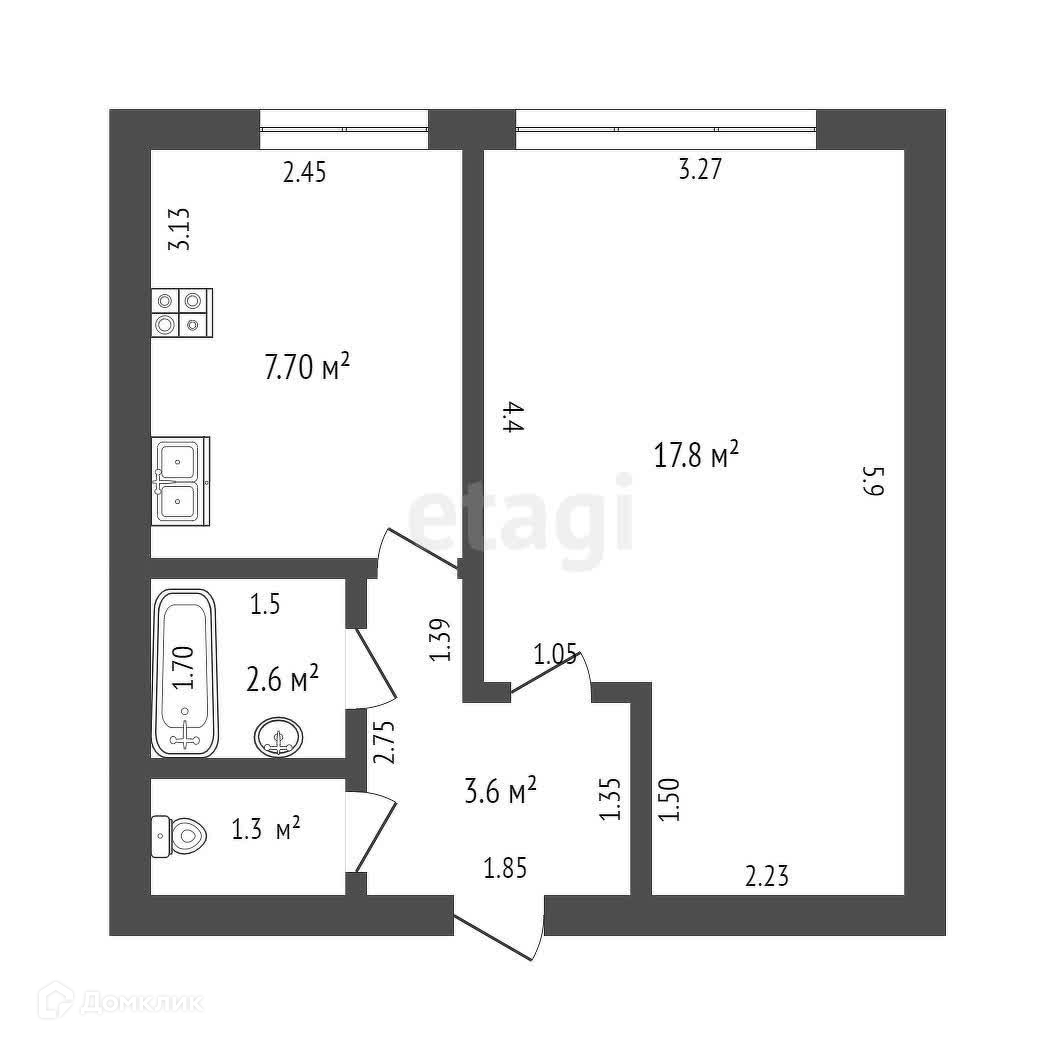 Общая площадь квартиры 33 кв. м., кухни - 7,7 кв. м., комнаты - 17,8 кв. м.