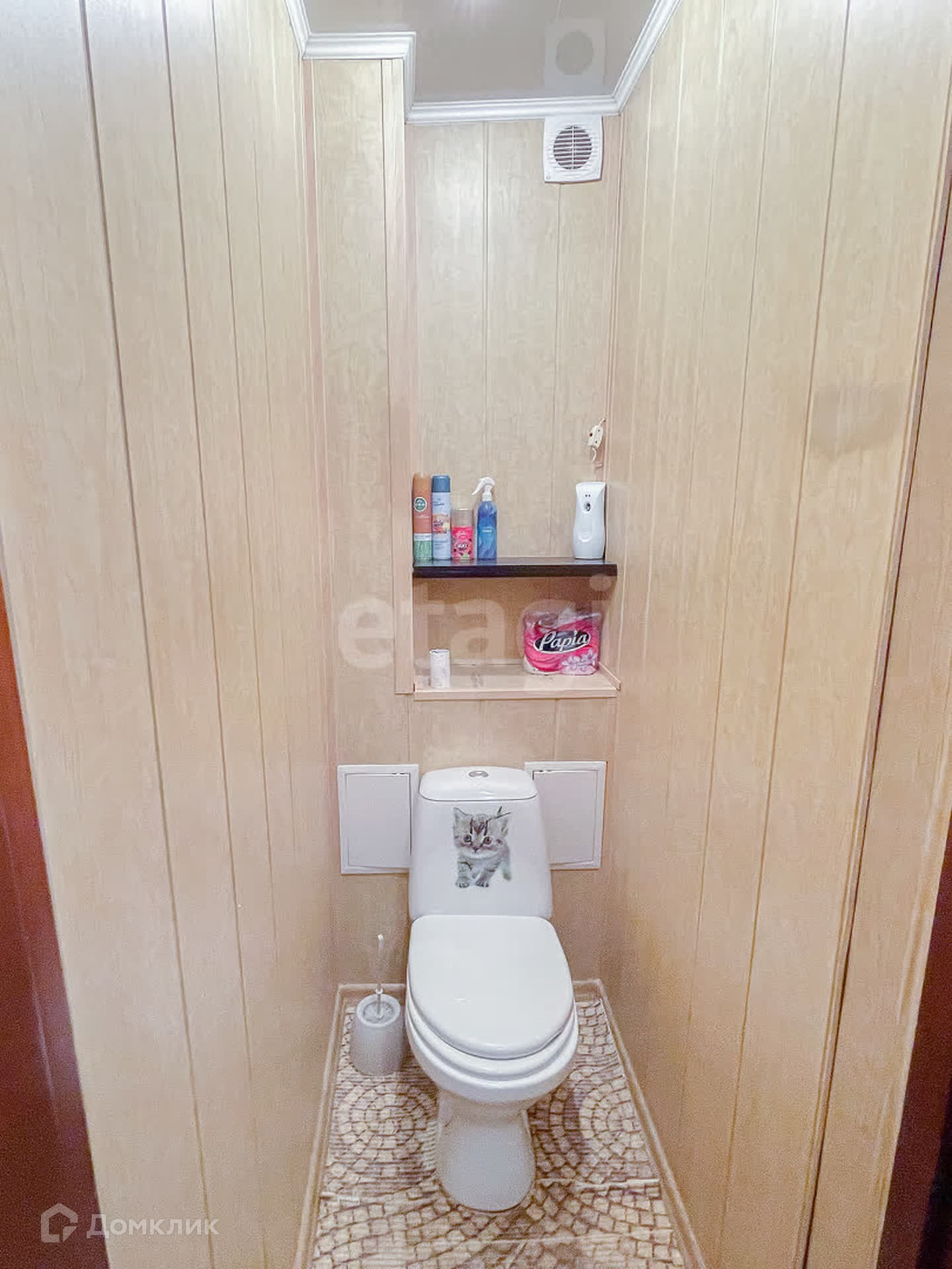 В квартире выполнен косметический ремонт, окна пластиковые, на полу линолеум, ванная выложена плиткой, туалет — МДФ-панели.