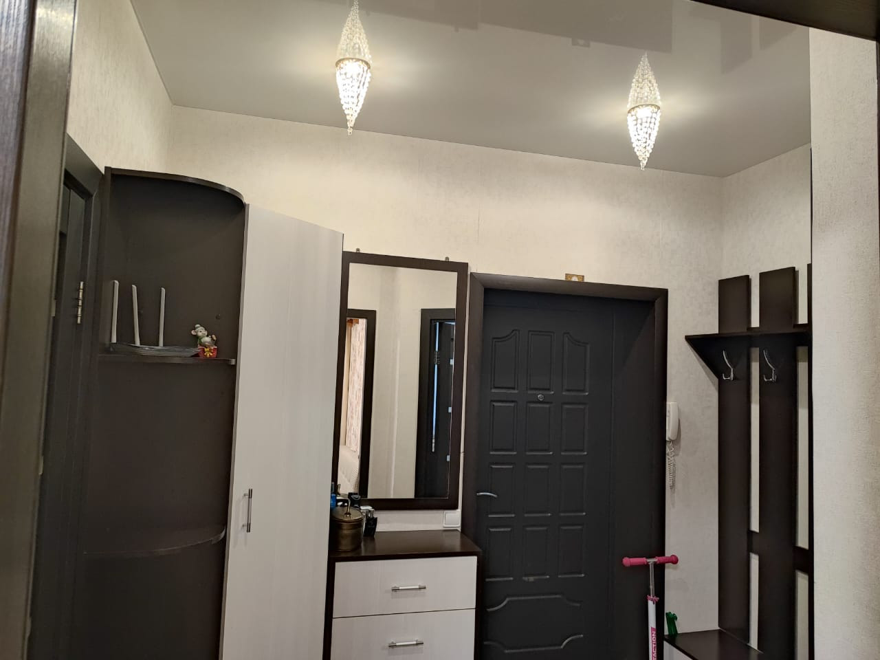 Квартира с ремонтом, брали в черновой, делали для себя, выровнены стены, стяжка, дополнительные розетки. На полу ламинат, современные межкомнатные двери,  железная шумоизоляционная входная дверь, натяжной потолок.