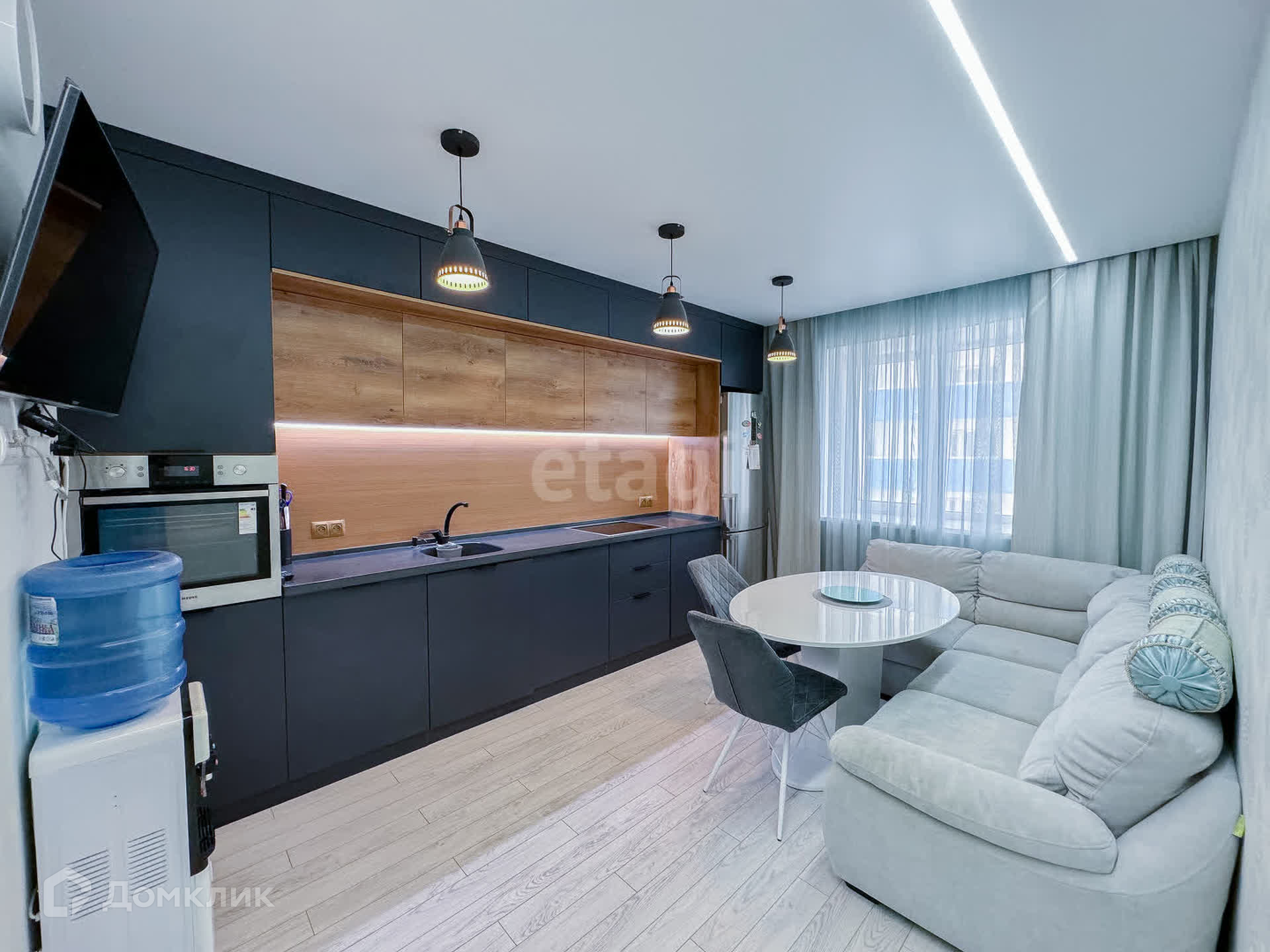 В квартире современный ремонт: ламинат, натяжные потолки с точечными лампами, которые создают уют и простор в комнате. Санузел раздельный, отделан кафелем. Лоджия благоустроенная, в летний период можно использовать как жилое помещение. Мебель и кухня выполнены из качественных материалов и остаются новым владельцам.