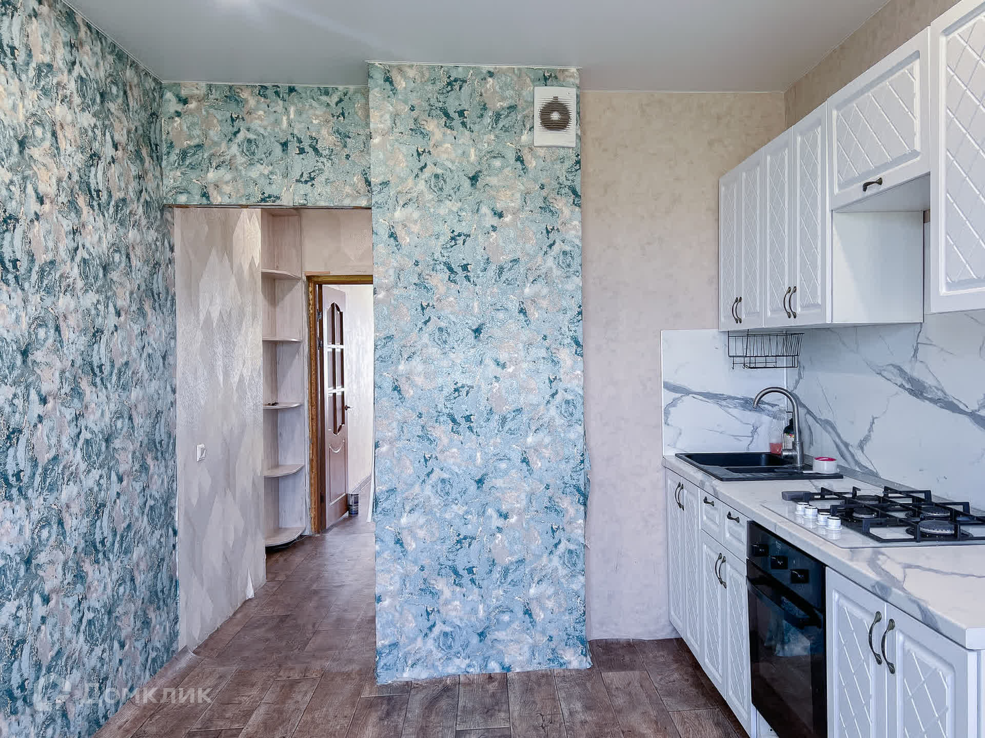 Просторная кухня - 12 м.кв., новым собственникам остается отличный кухонный гарнитур с встроенным духовым шкафом и варочной панелью.