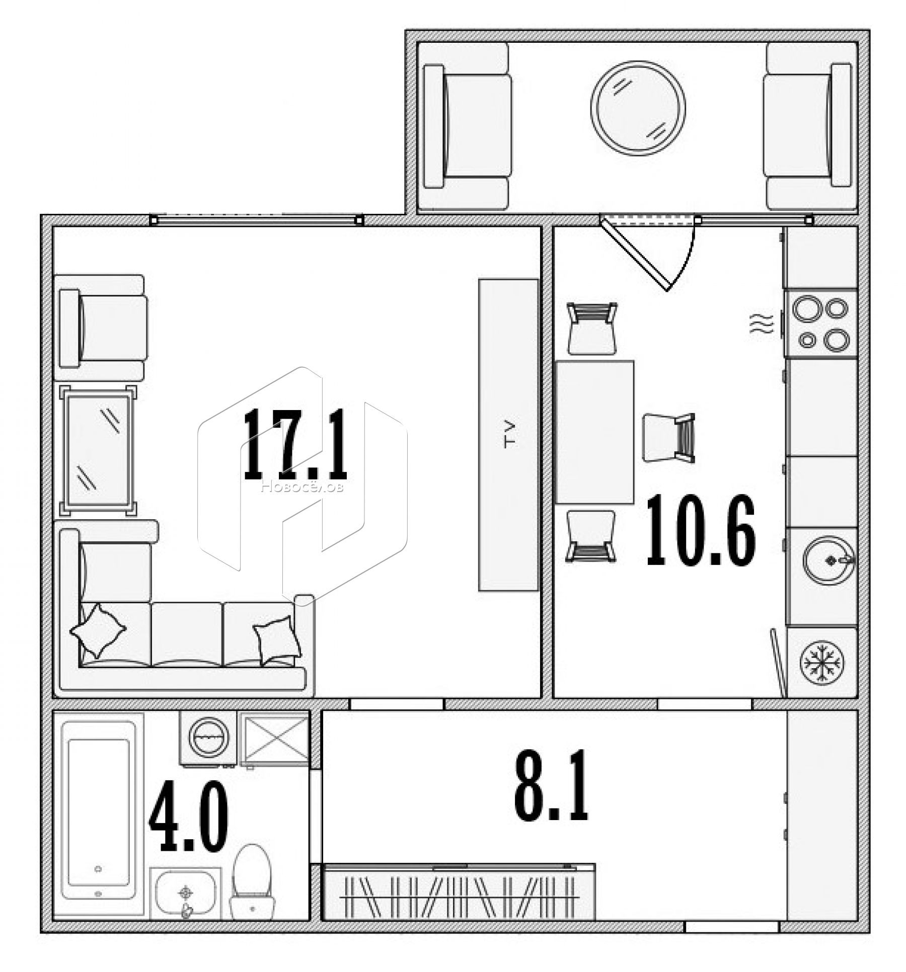 Жилая площадь 17.1 м2