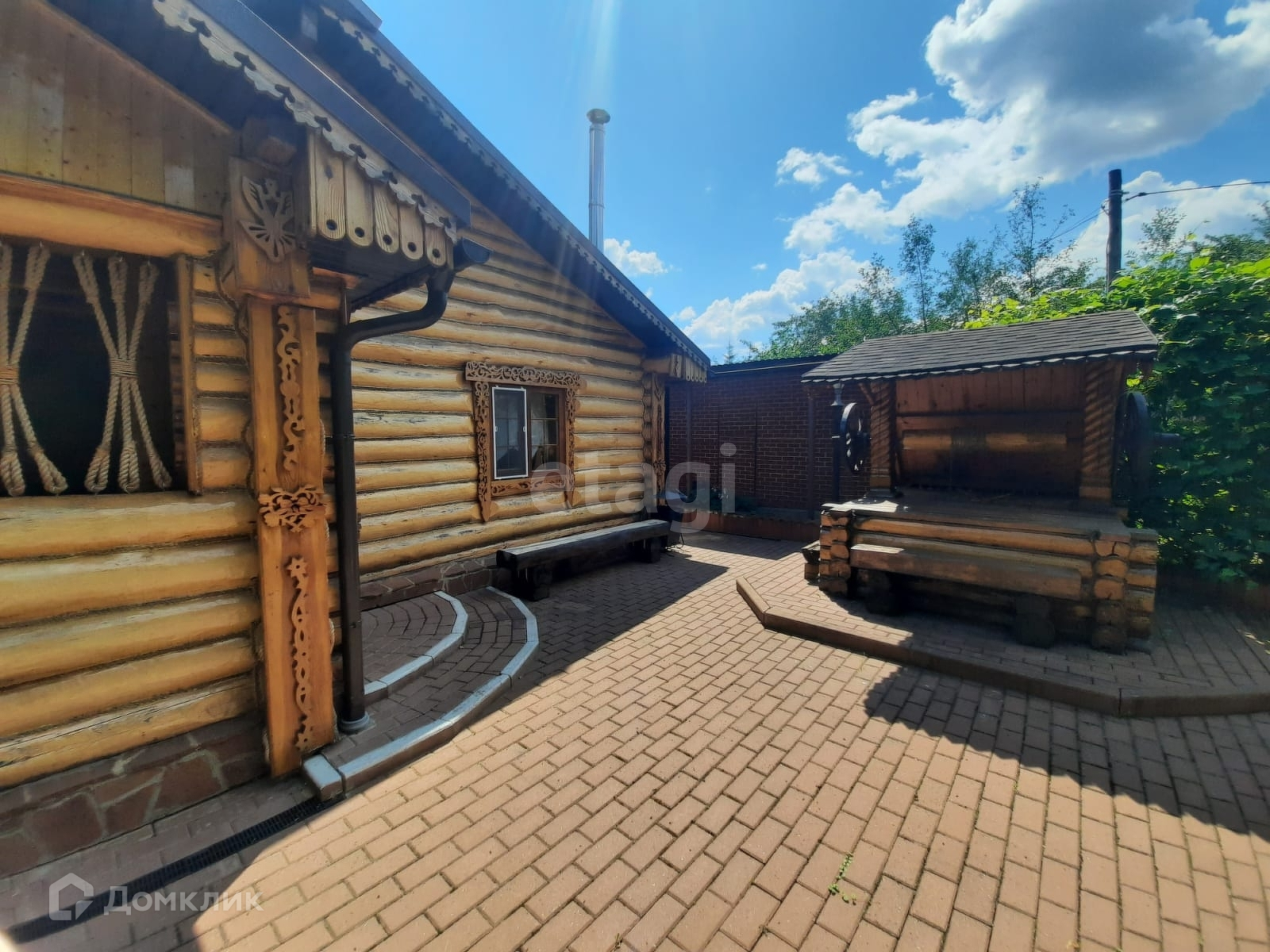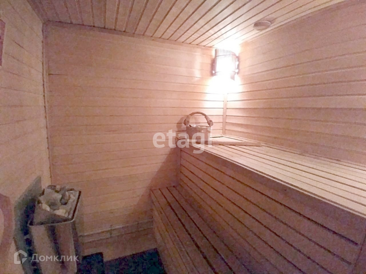 Отдельно стоящая баня размером 6,5X6 с русской парилкой и дровяной печью. В бане имеются следующие помещения: комната отдыха, промывочная с тропическим душем и обливным устройством, парная, санузел. В комнате отдыха установлена отдельная дровяная печь для отопления в холодное время года. К бане примыкает терраса площадью 92 кв.м. Под открытым воздухом можно окунуться в купель. Возле бани расположен колодец.