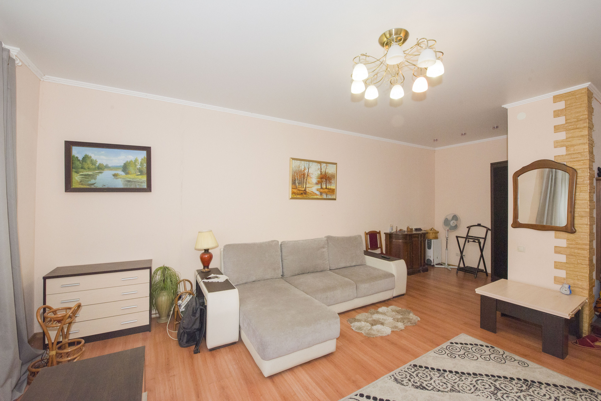В комнате: 25 кв. м., бархатный угловой диван, шкаф в нише, телевизор.
