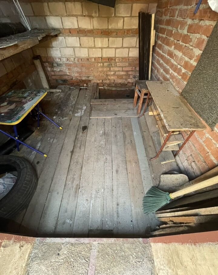Деревянный пол, антресоль для хранения банок, верстак.