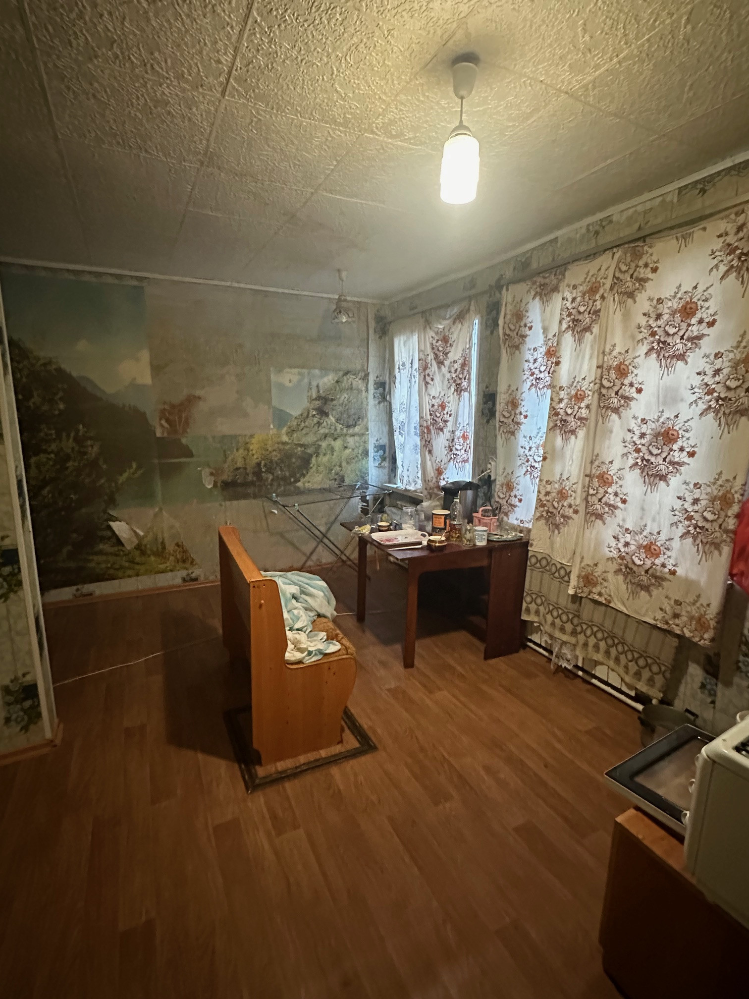 В квартире есть все удобства , газовое отопление ,вода канализация , небольшой земельный участок и место под баню