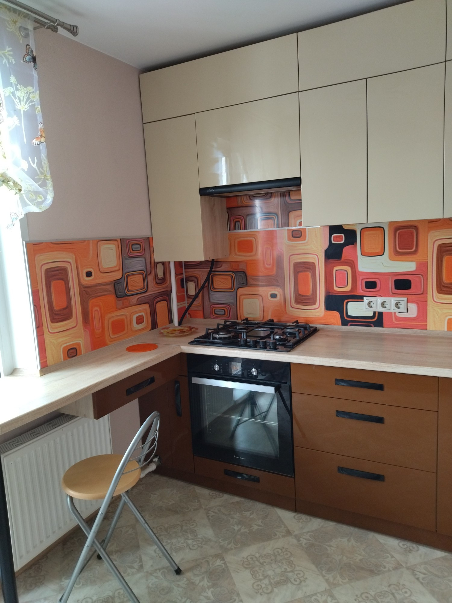 - Современный кухонный гарнитур с качественной встроенной техникой (электрический духовой шкаф, газовая варочная панель, вытяжка).