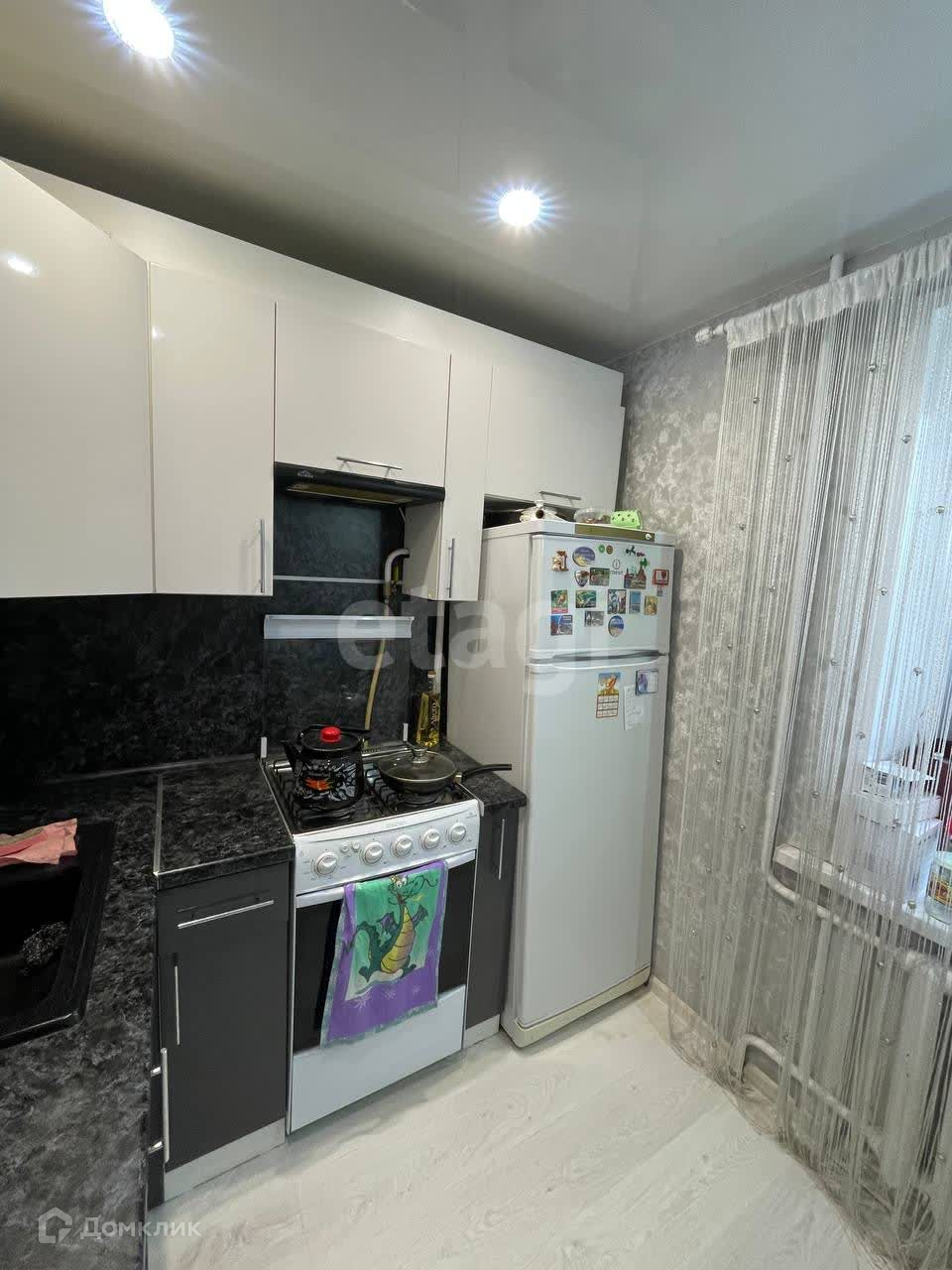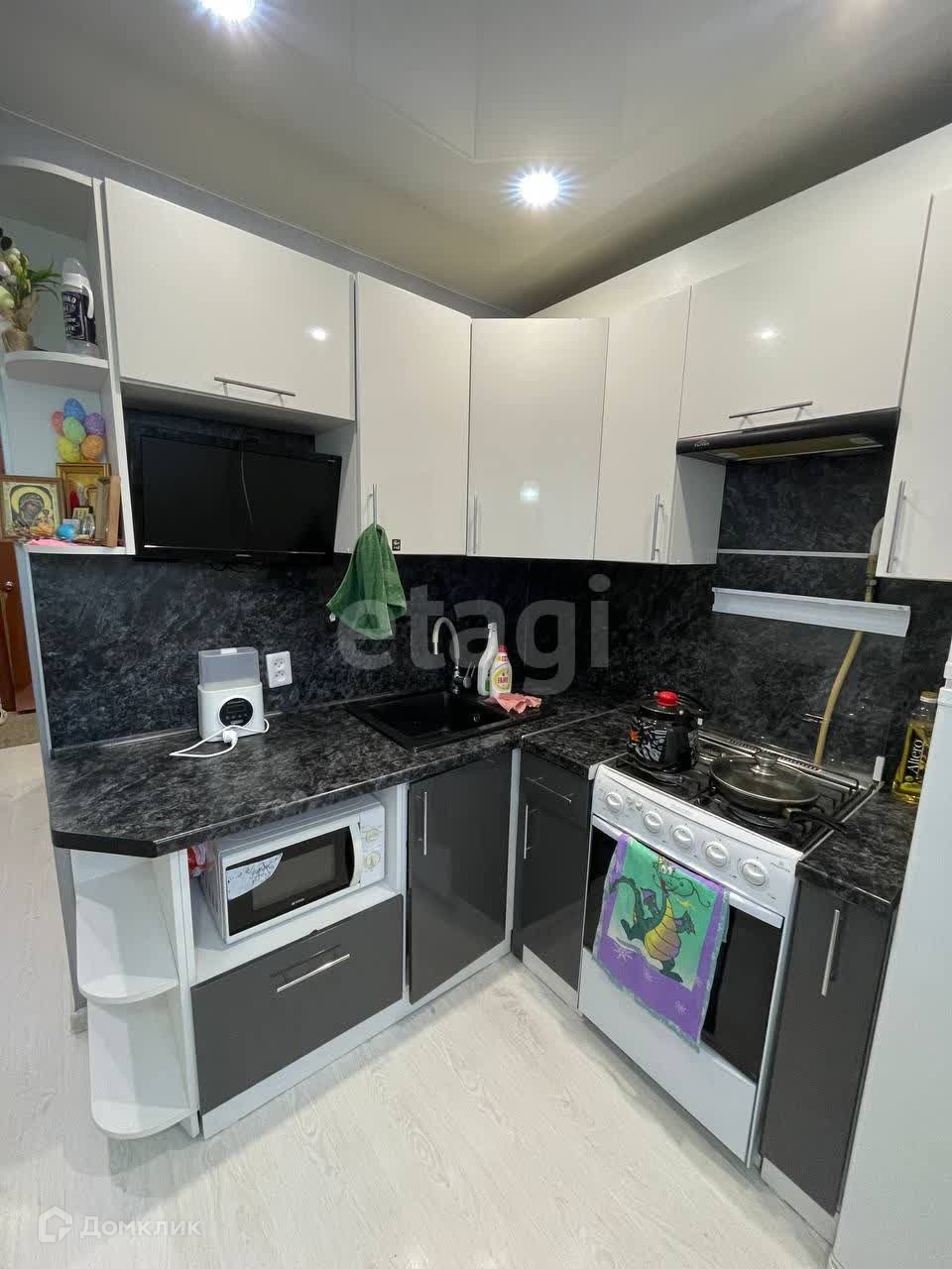 Кухня оформлена в современном стиле и оснащена всей необходимой техникой – от холодильника до плиты. Она удобно совмещена с обеденной зоной, где можно разместить стол и стулья для приятных ужинов. Яркие акценты в оформлении кухни делают её привлекательной и функциональной.
