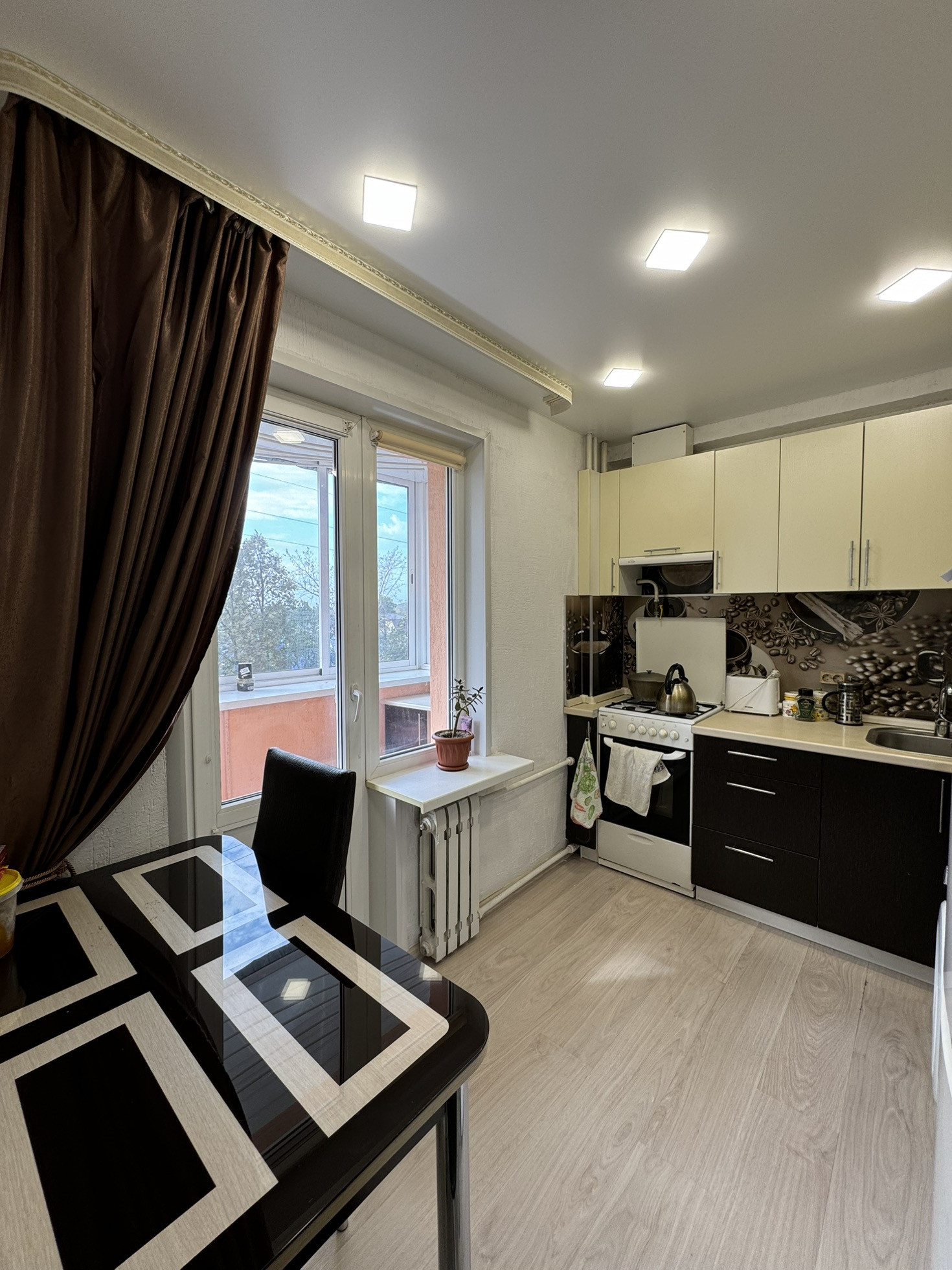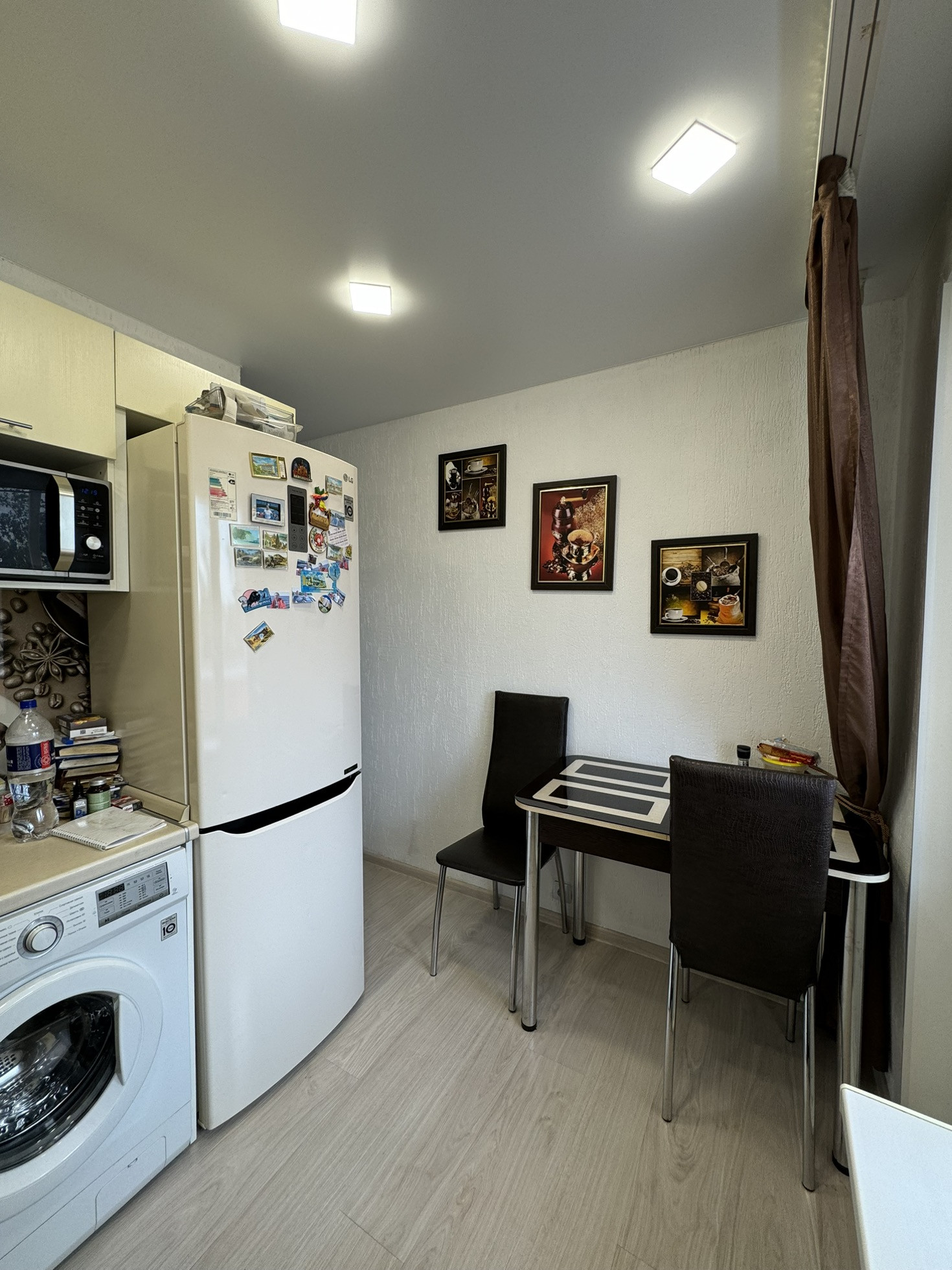Новым собственникам в кухне оставляем кухонный гарнитур, с газовой плитой, стиральной машиной, холодильником и встроенной посудомоечной машиной. Также остаются стол и стулья.