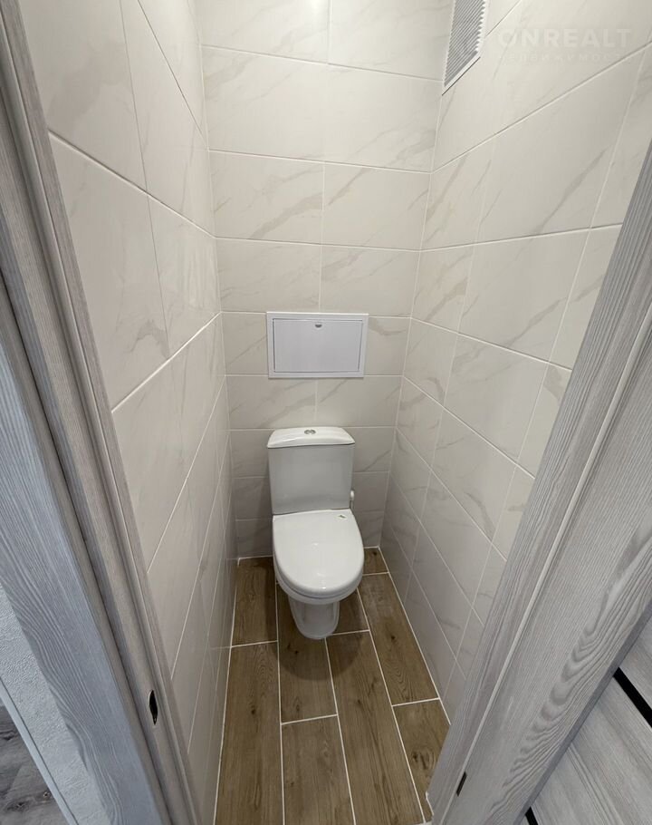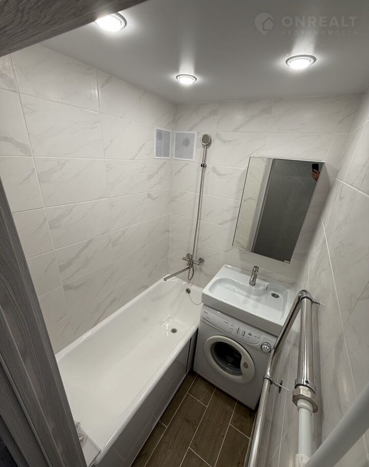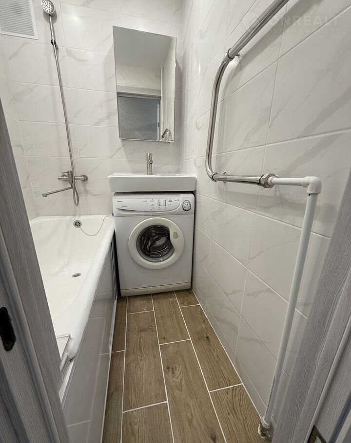 — Ванная и санузел раздельные, что является удобным решением. На полу уложена плитка из керамогранита, а на стенах кафель. Ванная восстановлена и облита эмалью, новая сантехника, новая раковина, новый полотенцесушитель, установлено зеркало с встроенным ящиком, а так же приятным бонусом для нового покупателя останется стиральная машинка в подарок, и конечно же в санузле установлен новый унитаз, на воду стоят новые счетчики.