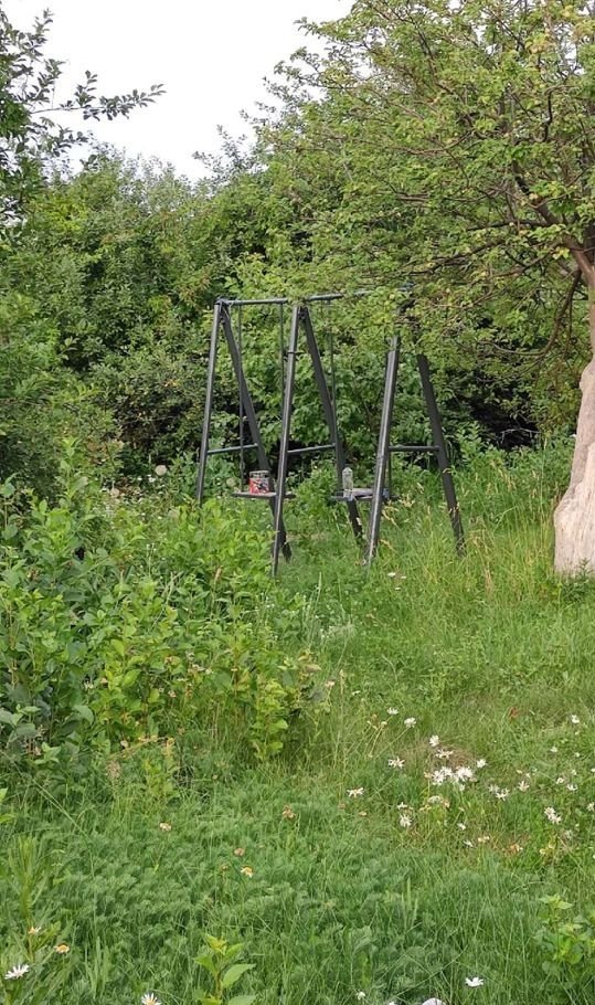 Есть качели, ровный участок для бассейна, участок за живой изгородью для зоны барбекю, качели, 2 плодоносящие яблони, между которыми идеально вписывается гамак!