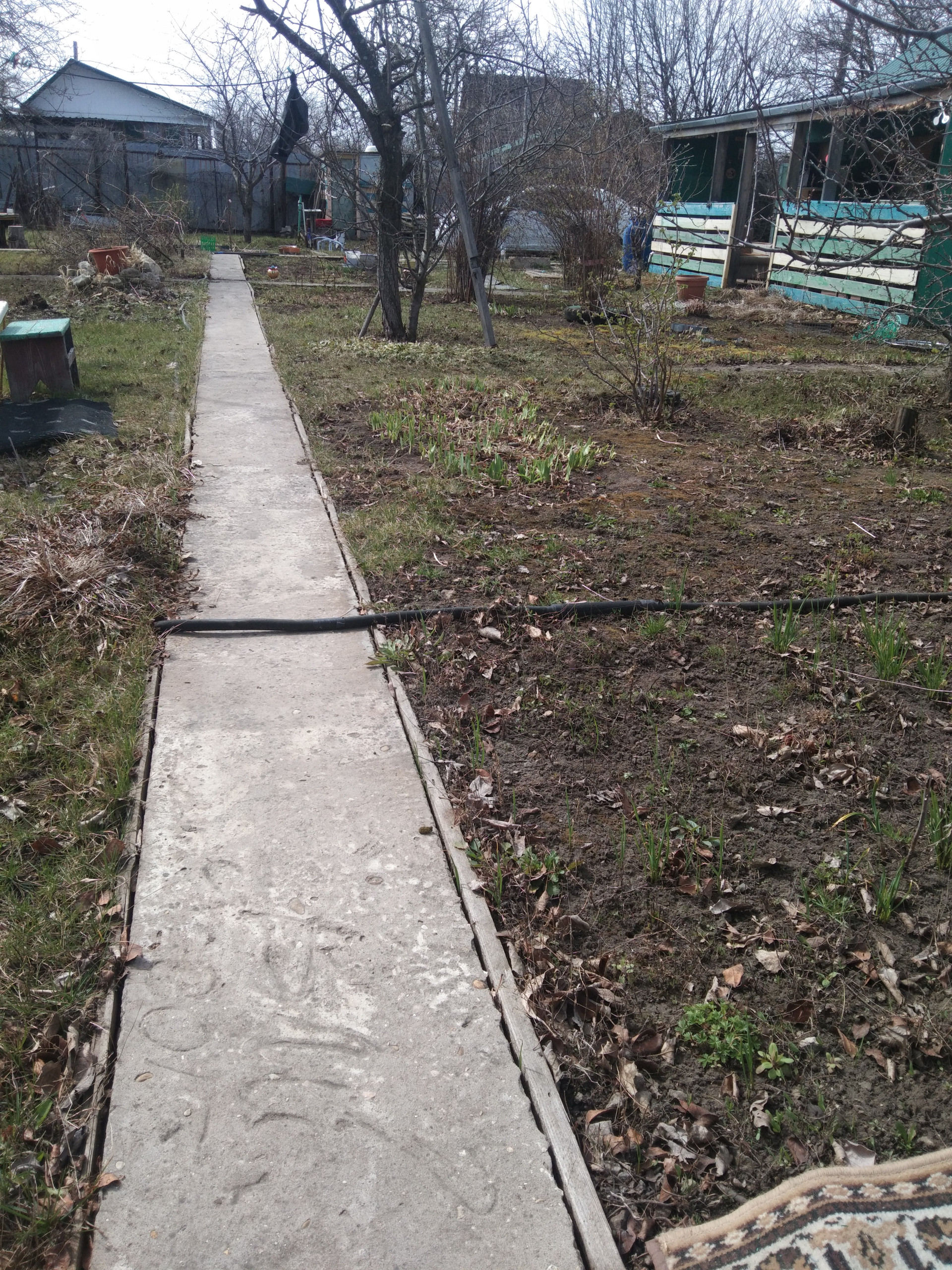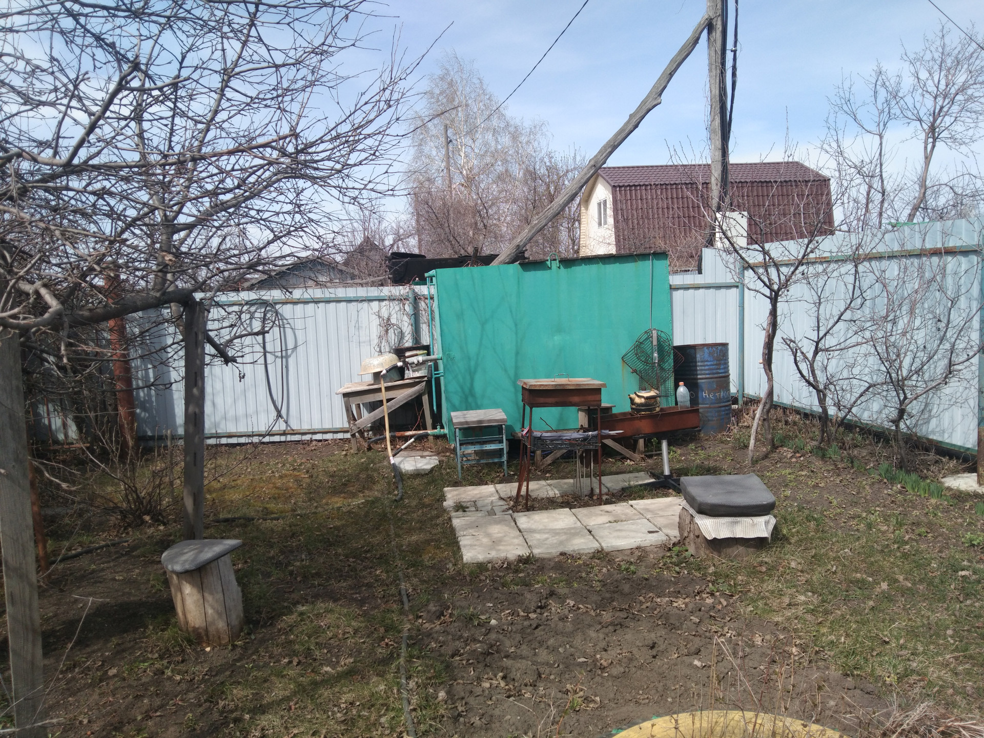 - Участок правильной формы, ровный, с бетонными дорожками, грамотно разделен на зону парковки (на 3 автомобиля), зону отдыха под навесом, выделено место под мангал.