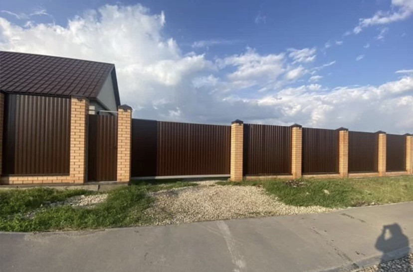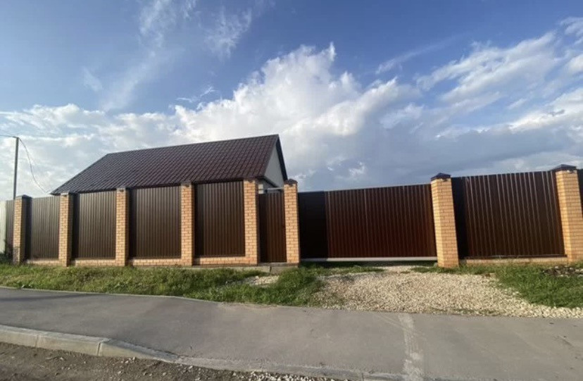 Высокий и красивый забор с автоматическими воротами.