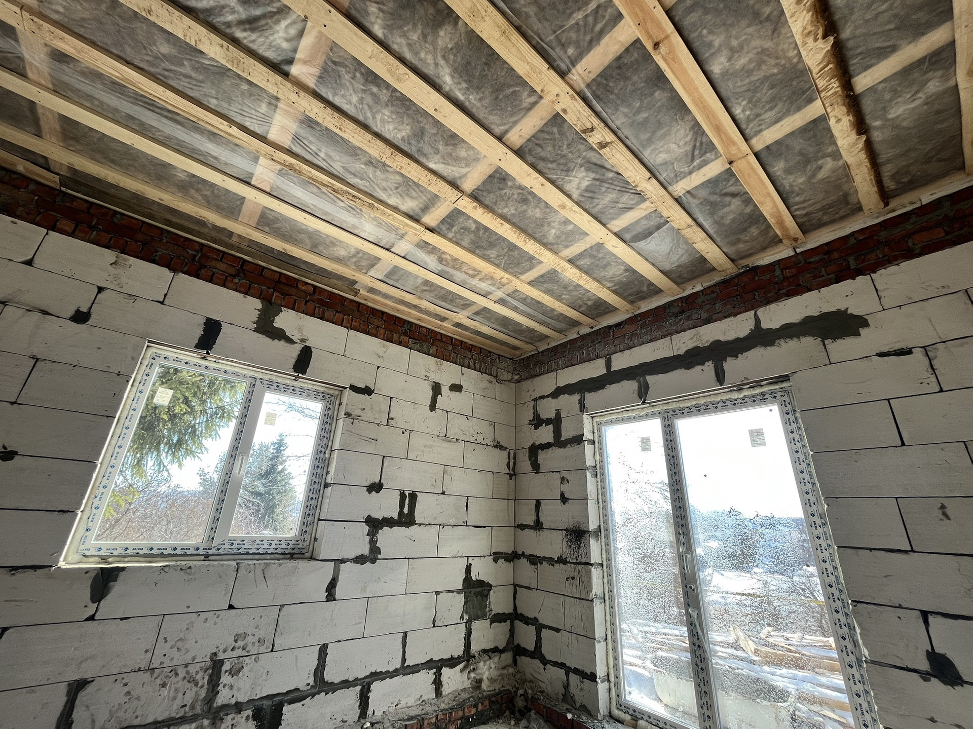 Крыша: Мауэрлат, лежень, стяжка 150*100мм; стропилы и основные элементы 150*40мм; Пароветроизоляция и гидроветразашита установлены; Утепление 150мм Кнауф.