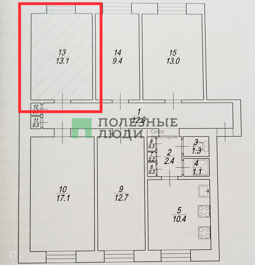 Общая площадь 13.3 м2
