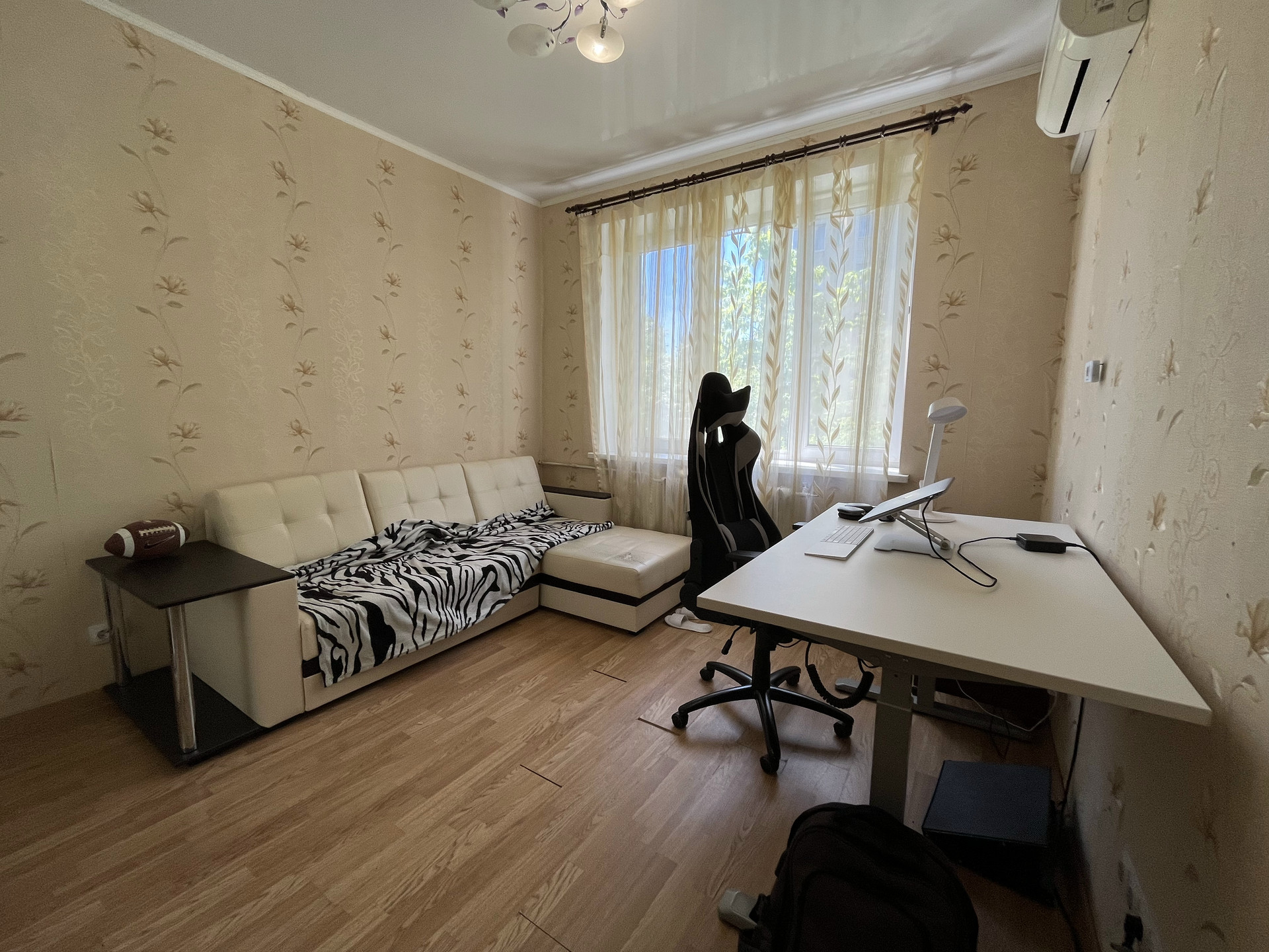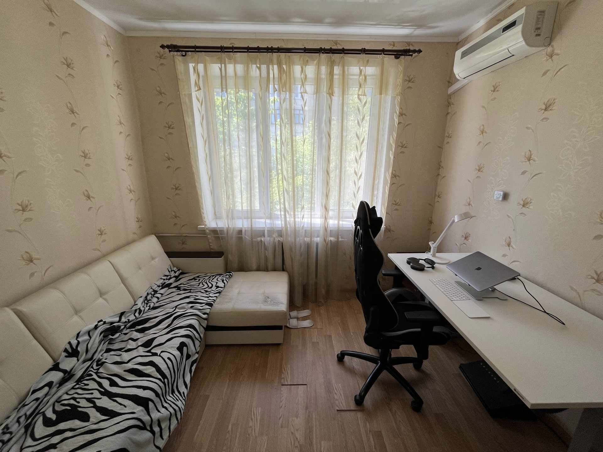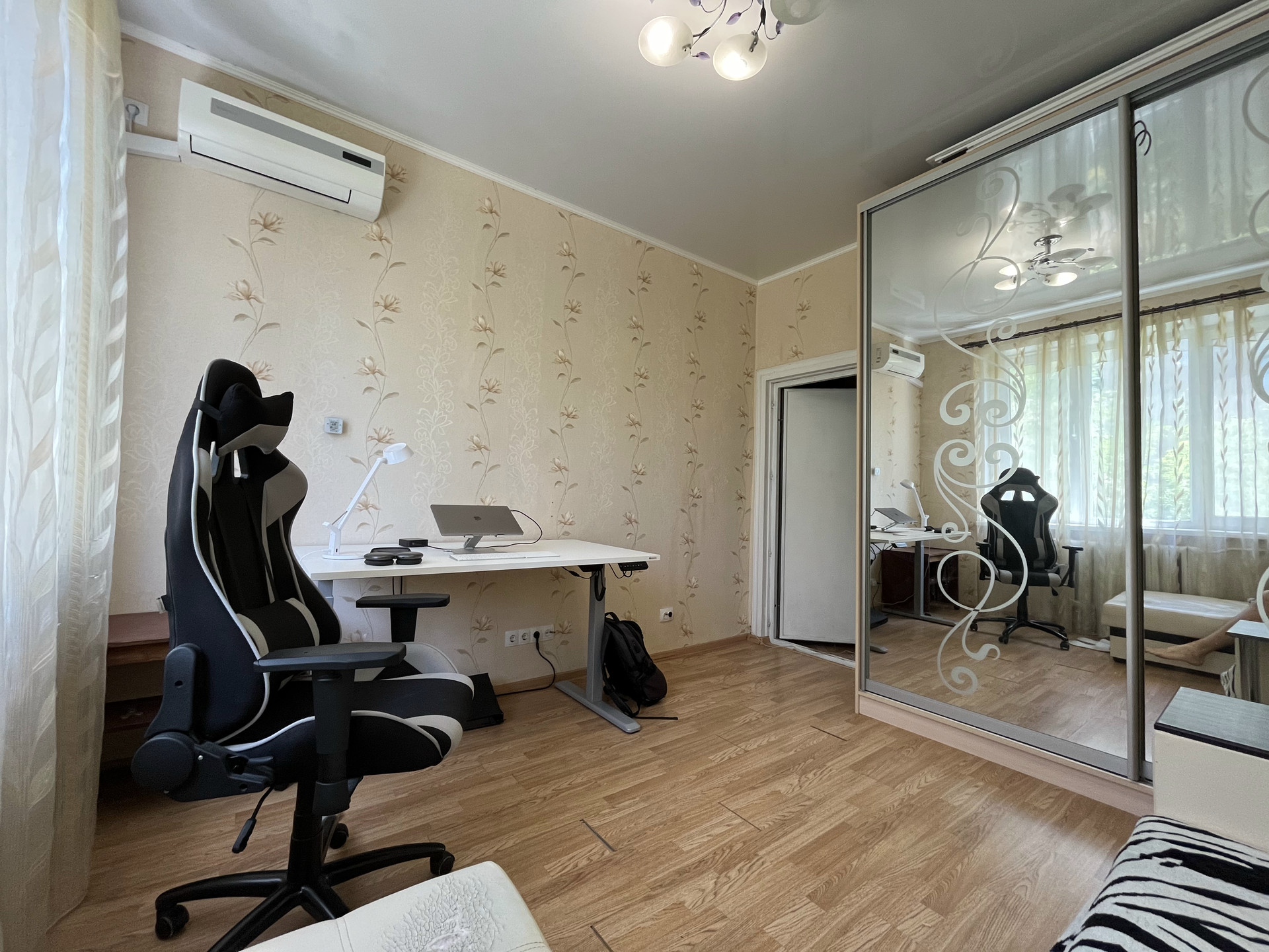 В комнате: двуспальный диван, кондиционер, огромный шкаф с зеркалами до потолка.