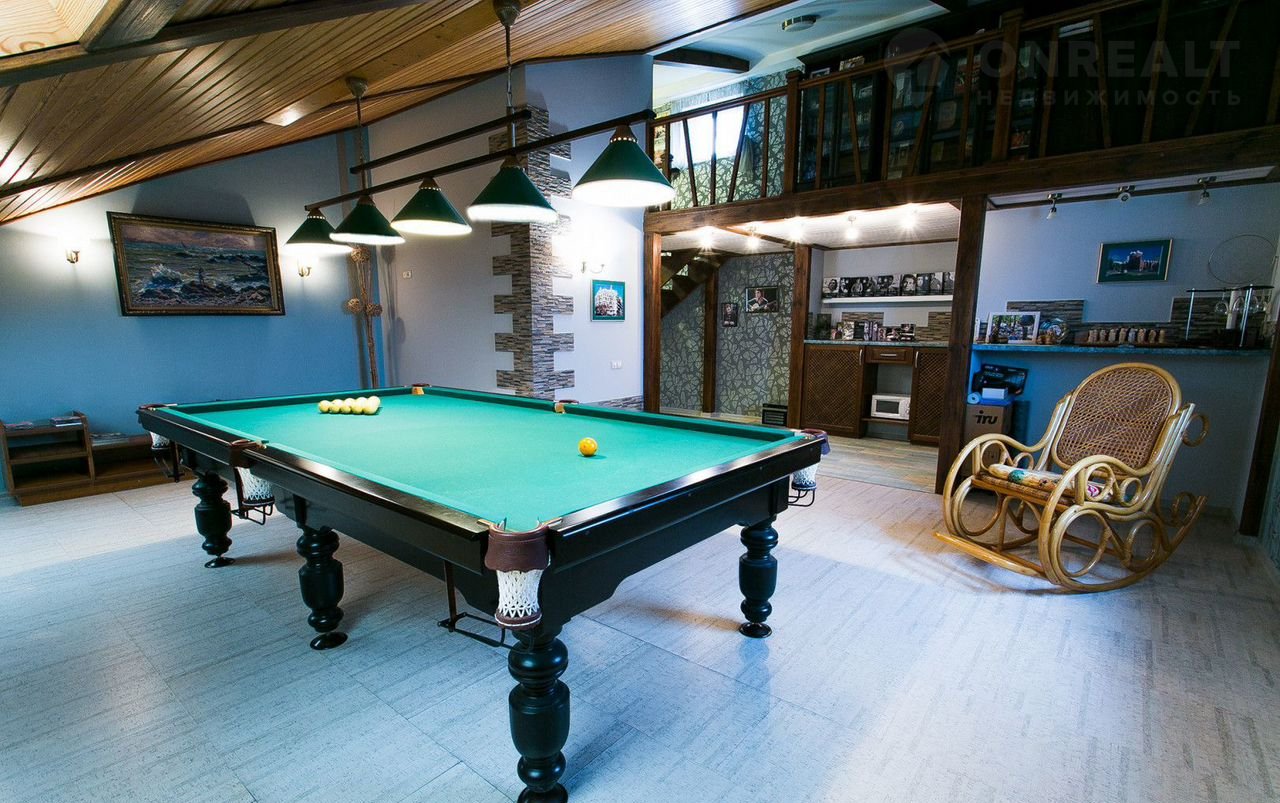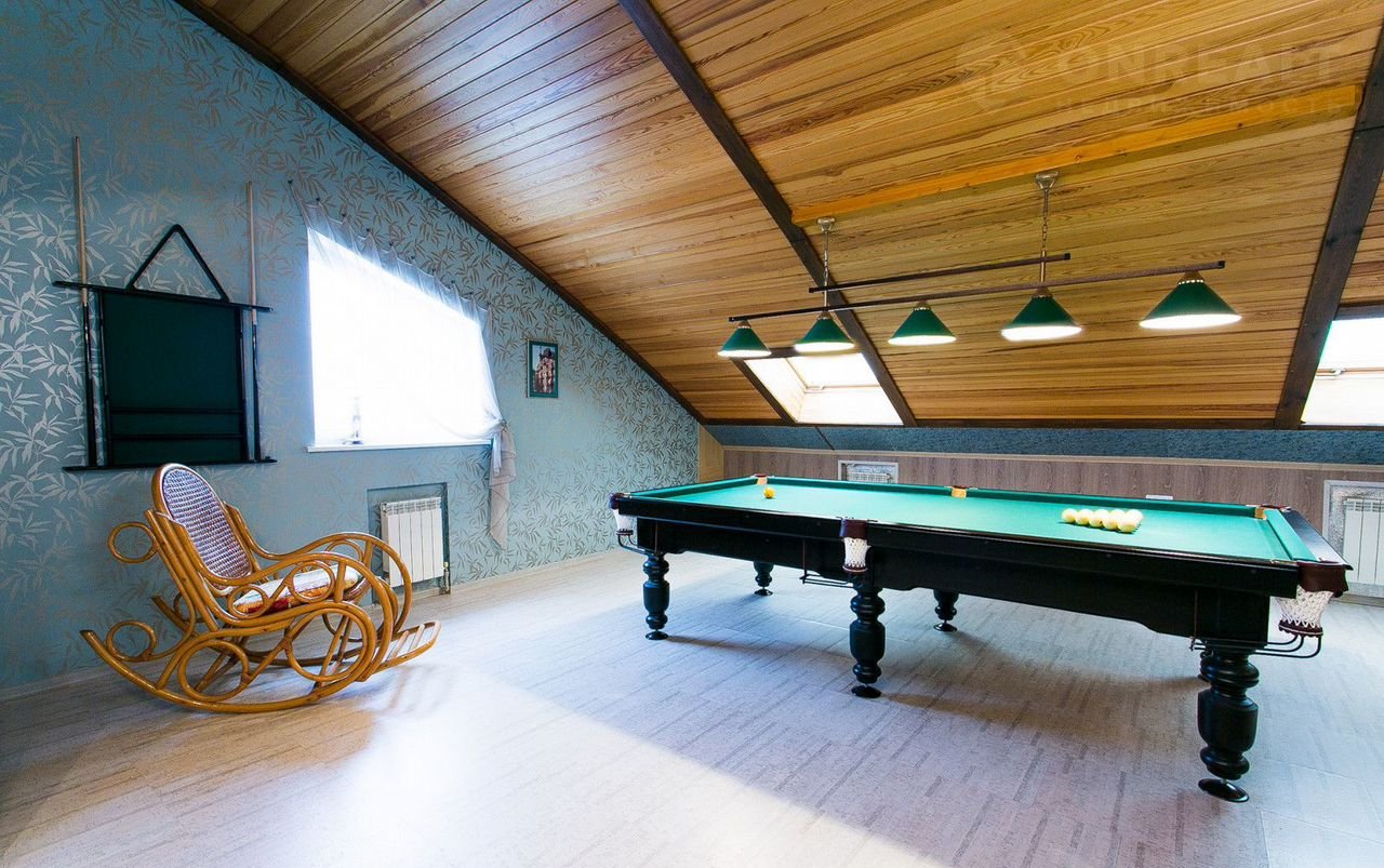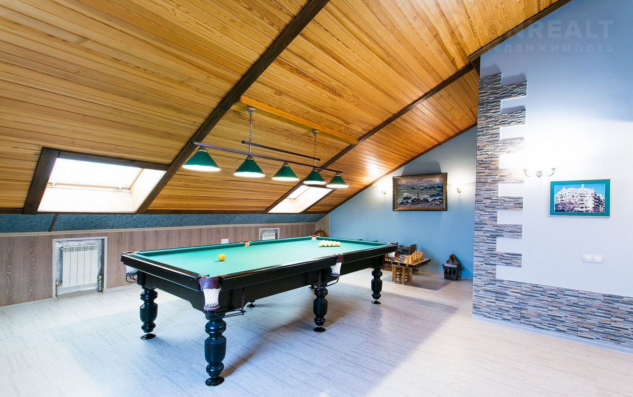 Мансарда – это мужской мир. Здесь расположены профессиональны бильярд, бар, библиотека – рабочий кабинет на антресоли , гостевая комната и санузел…