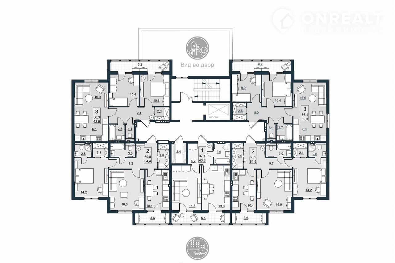 Днeвнaя зона oтдeленa oт спaлен, чтo coздaeт пpиватноcть и снижаeт уpовeнь шума в зонах отдыха. Такое зонирование особенно удобно для семей с детьми, или если кто-то работает из дома. Кухня-гостиная 16 м² - отличный вариант для семьи и приема гостей, здесь легко разместится полноценный обеденный стол, диванная зона и ТВ. Планировка позволяет гибко расставить мебель и зонировать пространство. Обе жилые комнат 9 м² и 10,4 м² изолированы - это важно для комфорта: каждый член семьи имеет личное пространство. Одна спальня идеально подойдет под детскую или, если пока вы живете вдвоем, под кабинет. Остекленная лоджия 6,2 м² - редкое и удачное решение, два выхода делают ее более функциональной. Можно обустроить зону отдыха, оранжерею или спортивный уголок. Полноценная гардеробная избавляет от необходимости ставить громоздкие шкафы. Можно использовать для хранения сезонных вещей, бытовой химии, пылесоса и прочее. Холл 8м2 грамотно распределяет потоки между зонами квартиры.