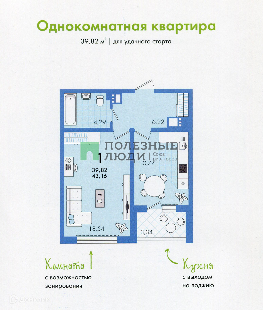 Общая площадь 39,82 м² (будет указана в ЕГРН). Проектная (полезная) площадь 43,16 м² - это уже с лоджией.