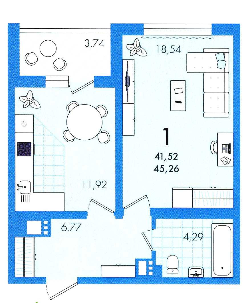 - просторная площадь 45,26 кв.м; - большой холл с нишей под гардероб;