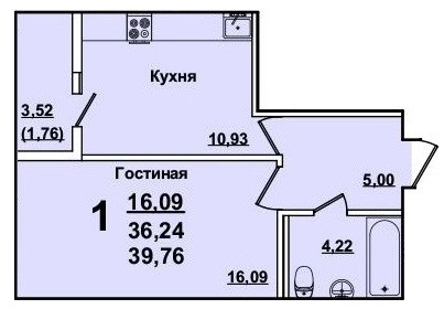 Общая площадь 39.6 м2