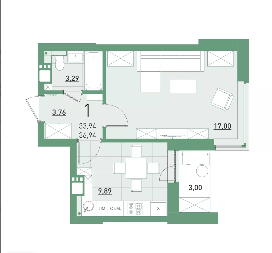 * общая площадь 36,69м