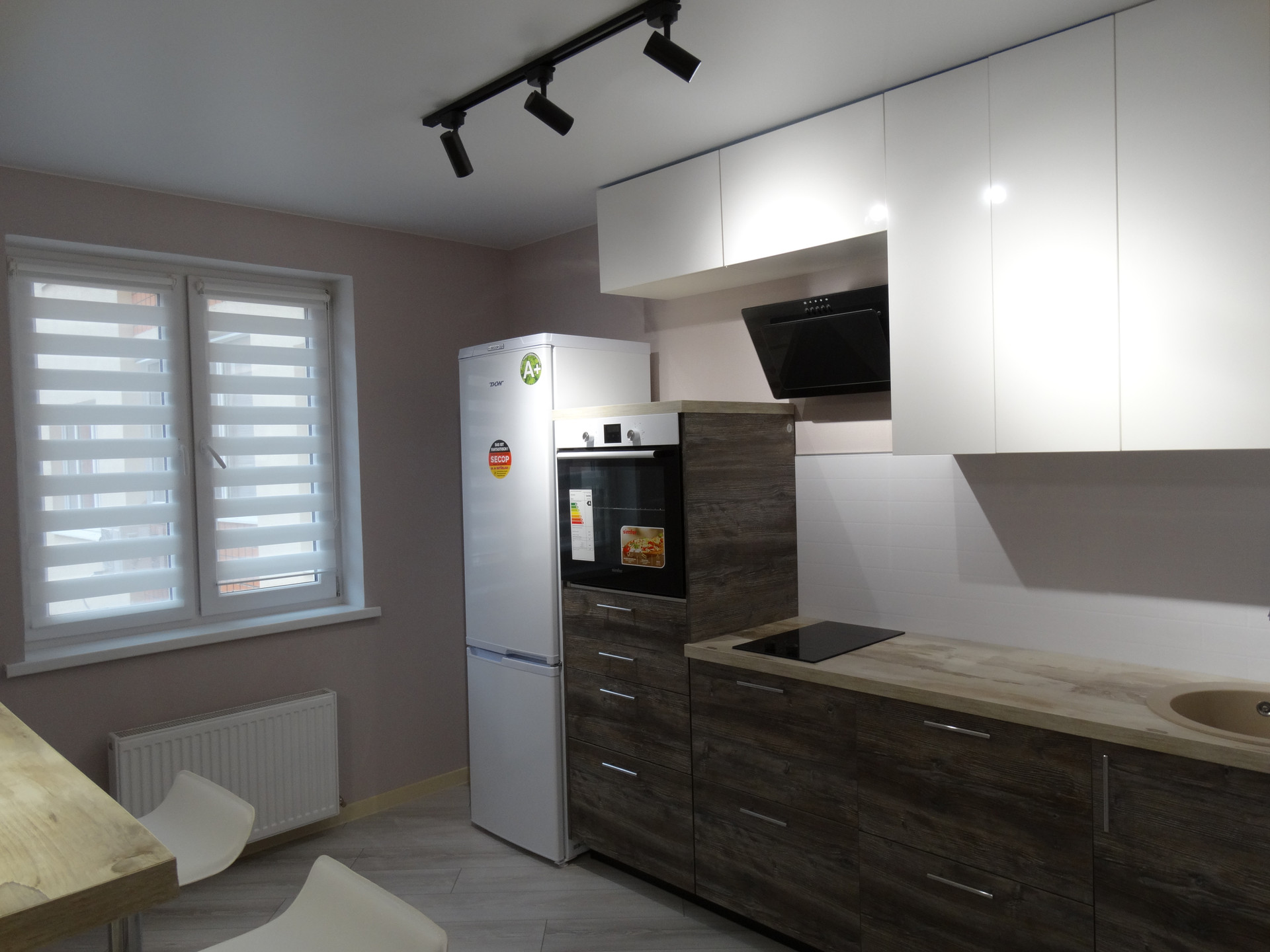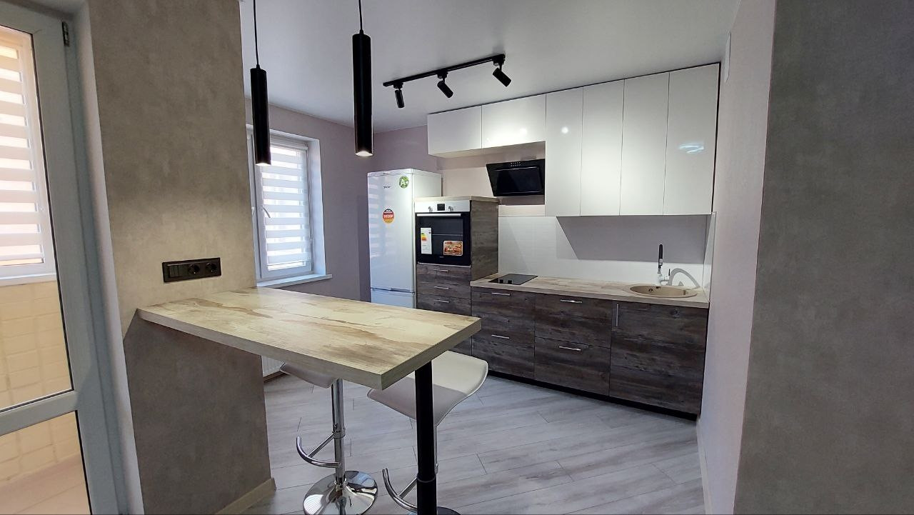 Кухня – многофункциональна: за обеденной зоной, выполненной в виде барной стойки с высокими стульями, можно не только принимать пищу, но и заниматься своими рабочими делами за ноутбуком или смартфоном.