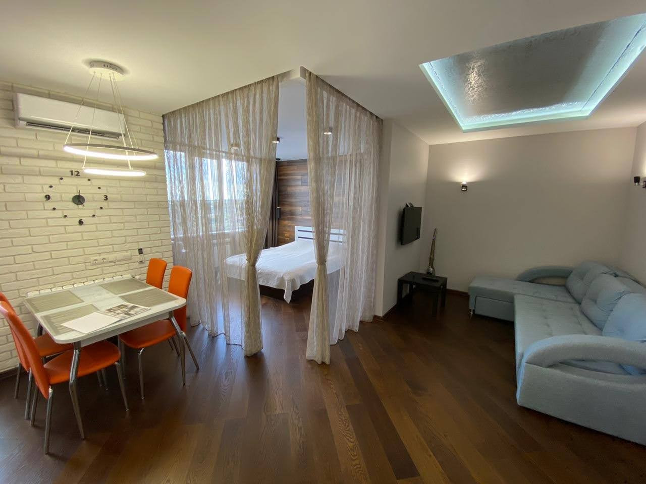 В квартире выполнен дизайнерский ремонт по индивидуальному проекту, с дорогостоящими строительными материалами (Испания, Италия), тёплые полы в ванной комнате и на лоджии,  в остальной квартире паркет.