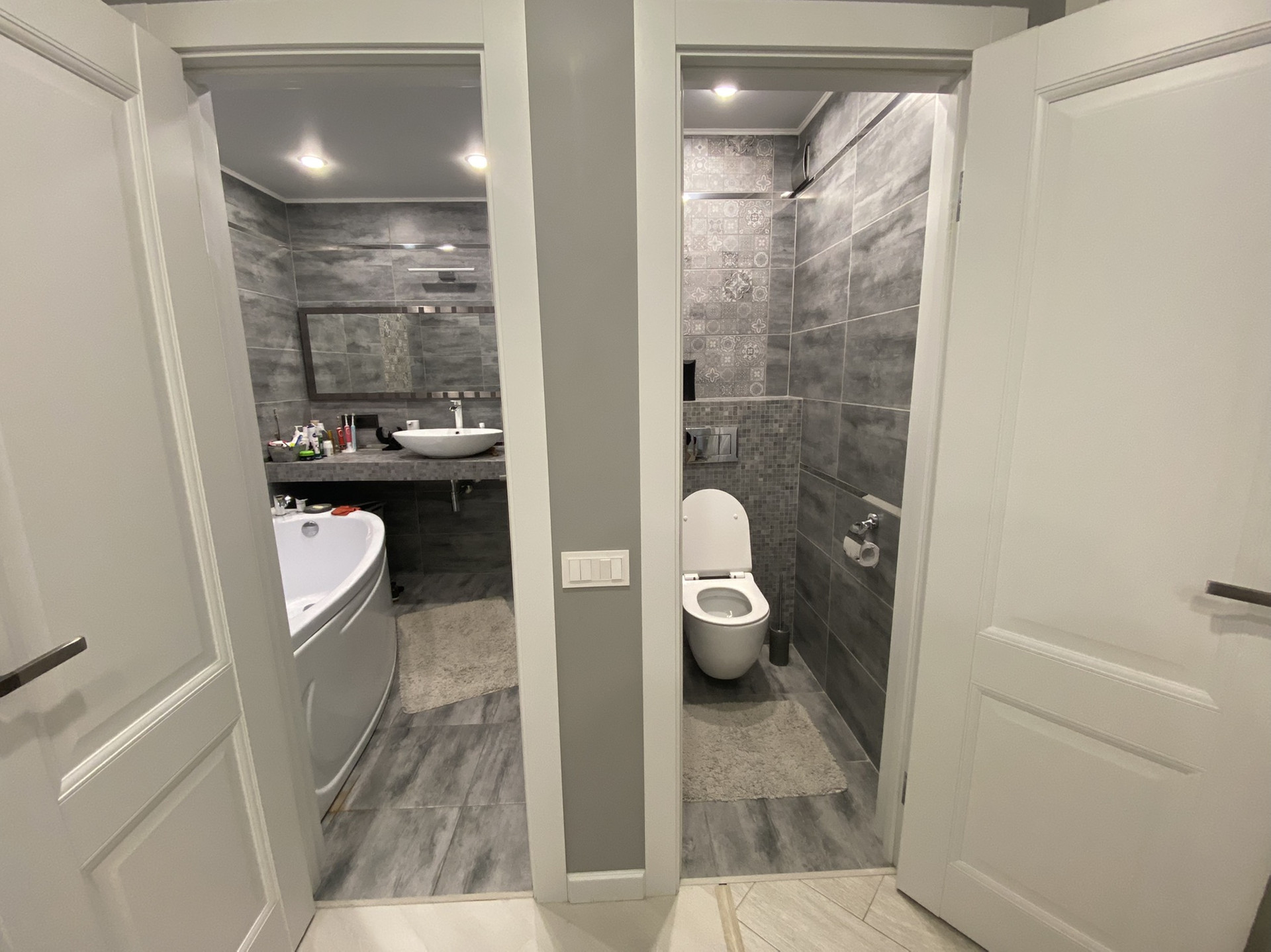 В прихожей так же шкаф,вешалка и тумбочка с зеркалом,пуф,видеодомофон, при в ходе теплый пол.