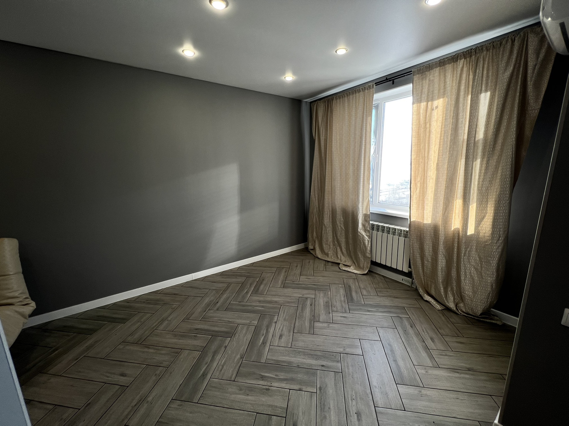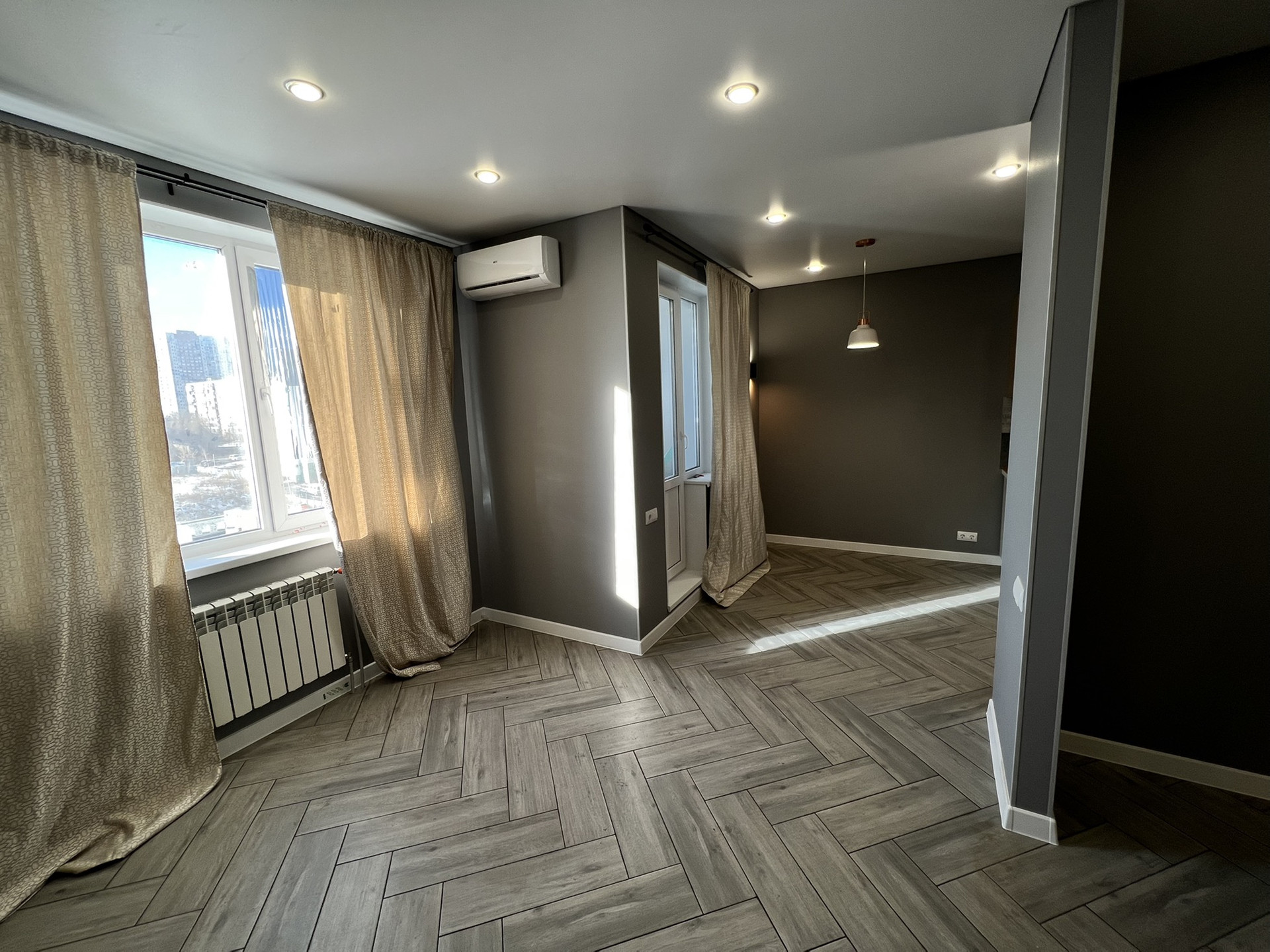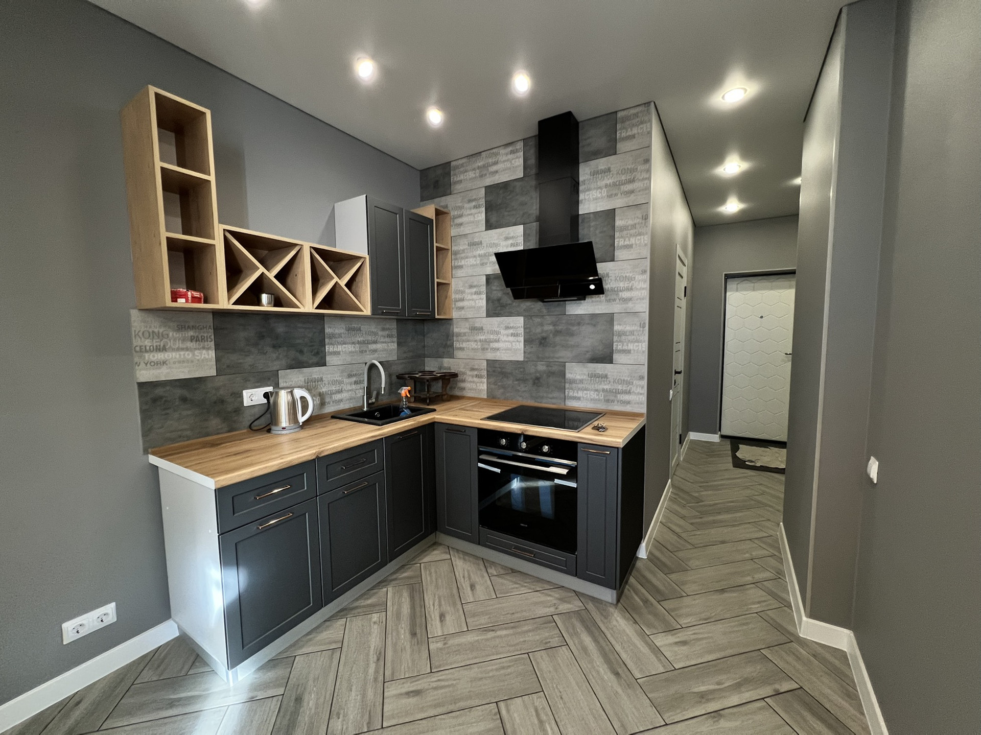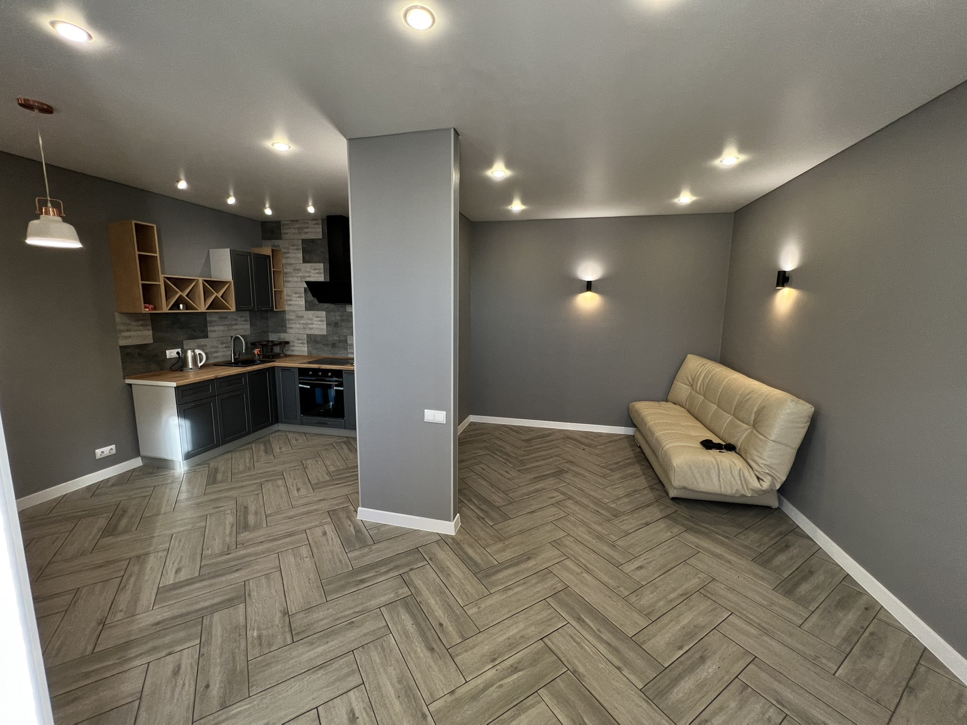 В квартире выполнен ремонт, установлена кухонная мебель и техника: духовой шкаф, вытяжка, индукционная варочная панель.