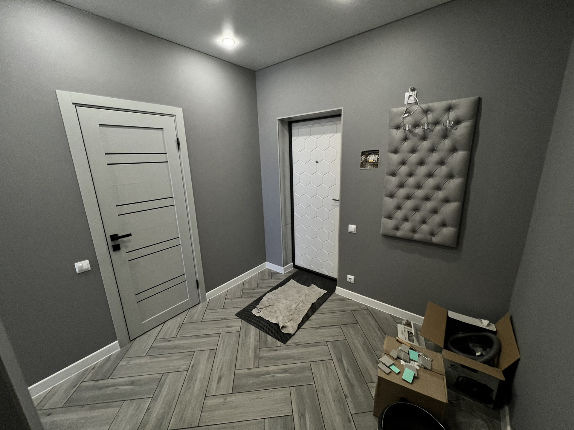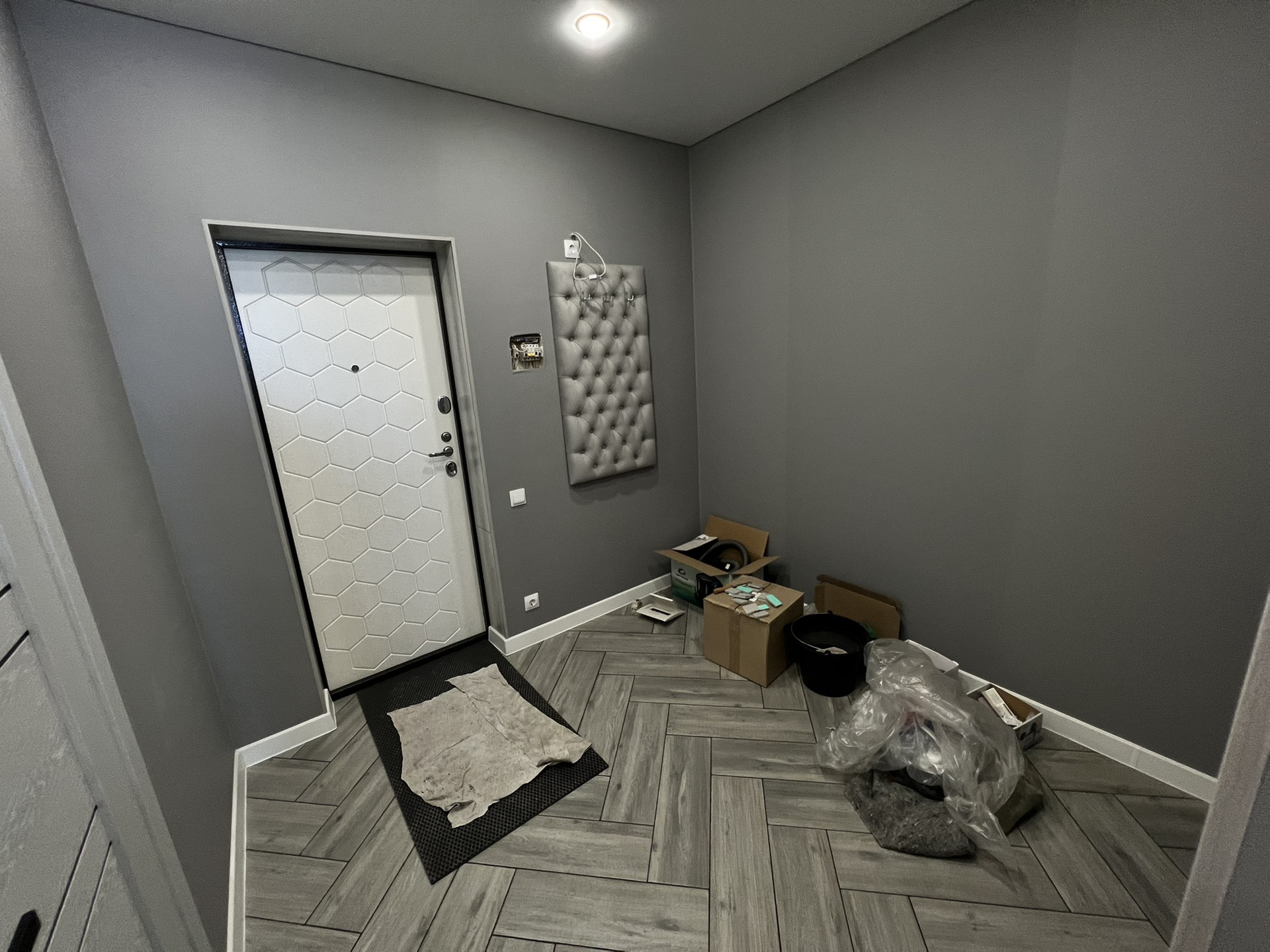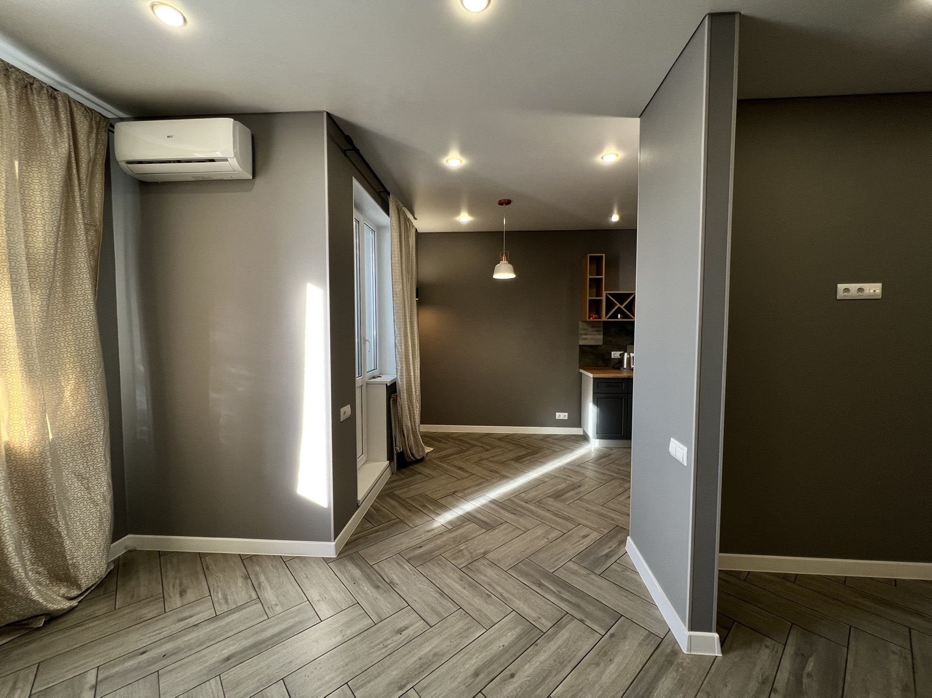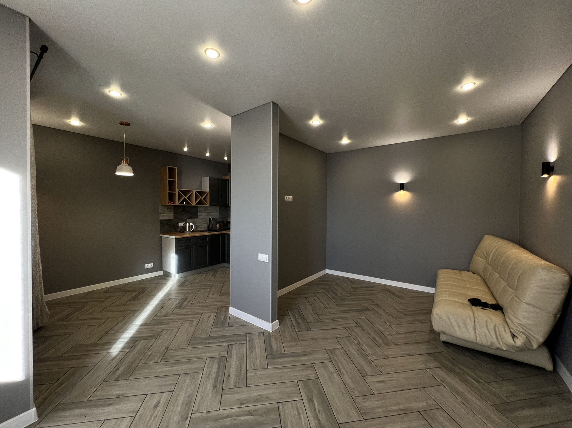 В квартире выполнен ремонт, установлена кухонная мебель и техника: духовой шкаф, вытяжка, индукционная варочная панель.