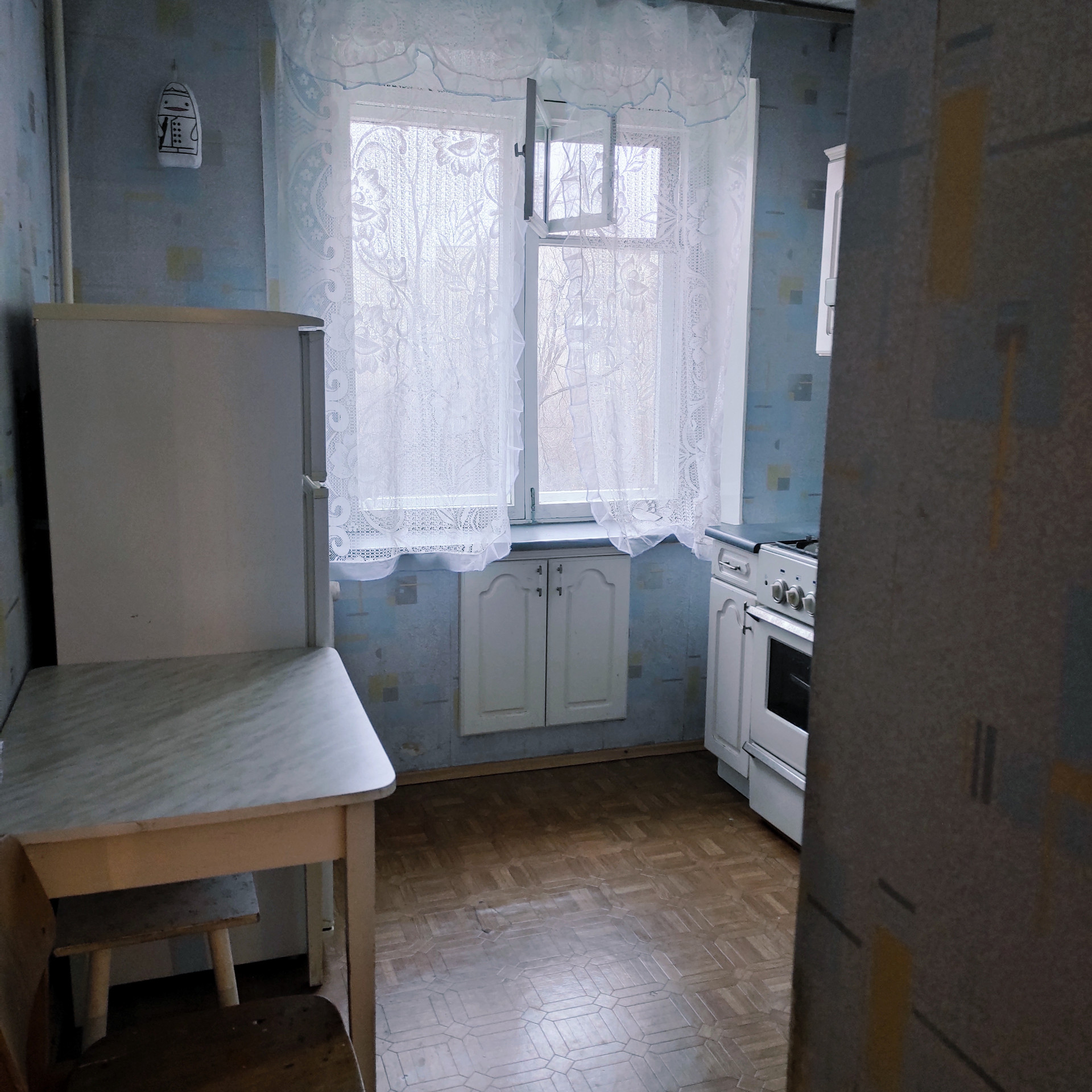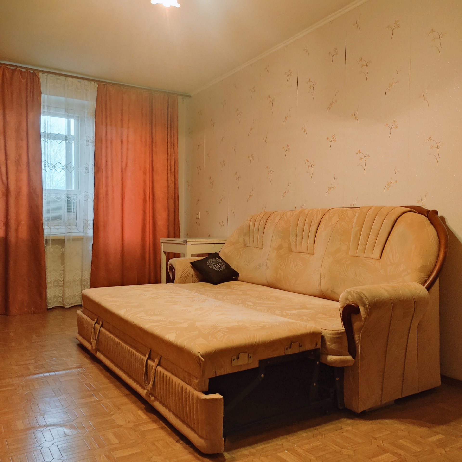 Мебель на фото- остается. Имеется стенка в комнате, раскладной диван, кровать, встроенный в окно кондиционер, встроенная мебель на кухне, стол. На полу линолеум. Сантехника и санузел в хорошем состоянии. Отопление зимой отличное. Имеется домофон, счетчики на воду и электричество, газовая плита.
