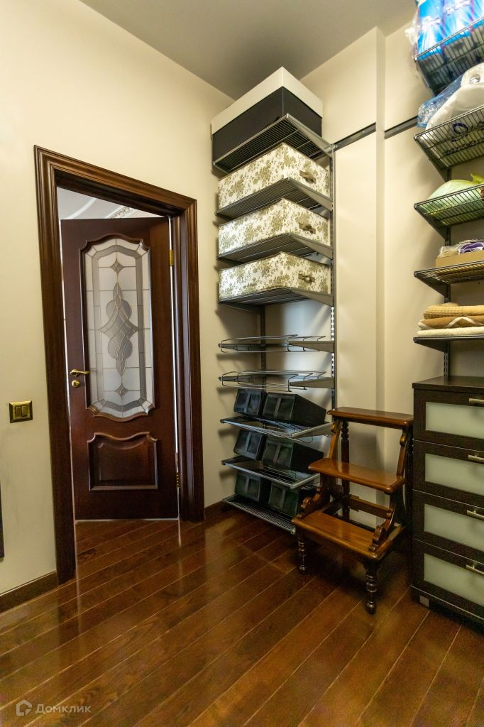 Из спальни вход в вместительную гардеробную, которая оборудована системой хранения "ELFA" Швеция. Сейф для хранения оружия и ценностей с отделкой из массива дуба.