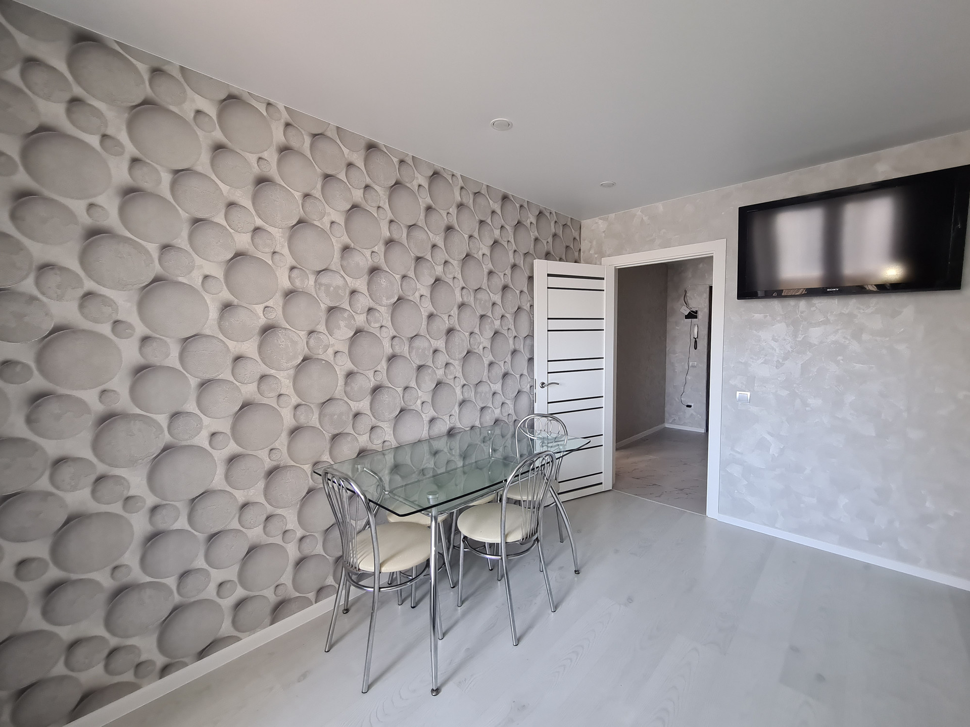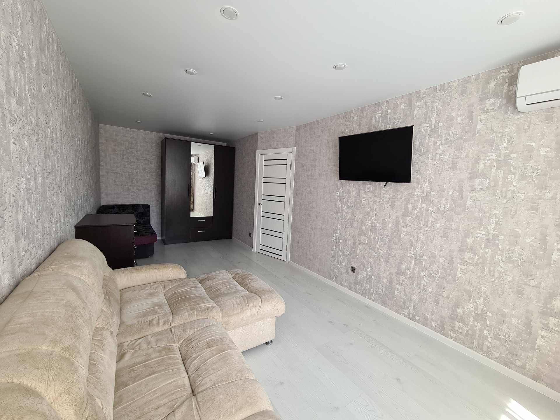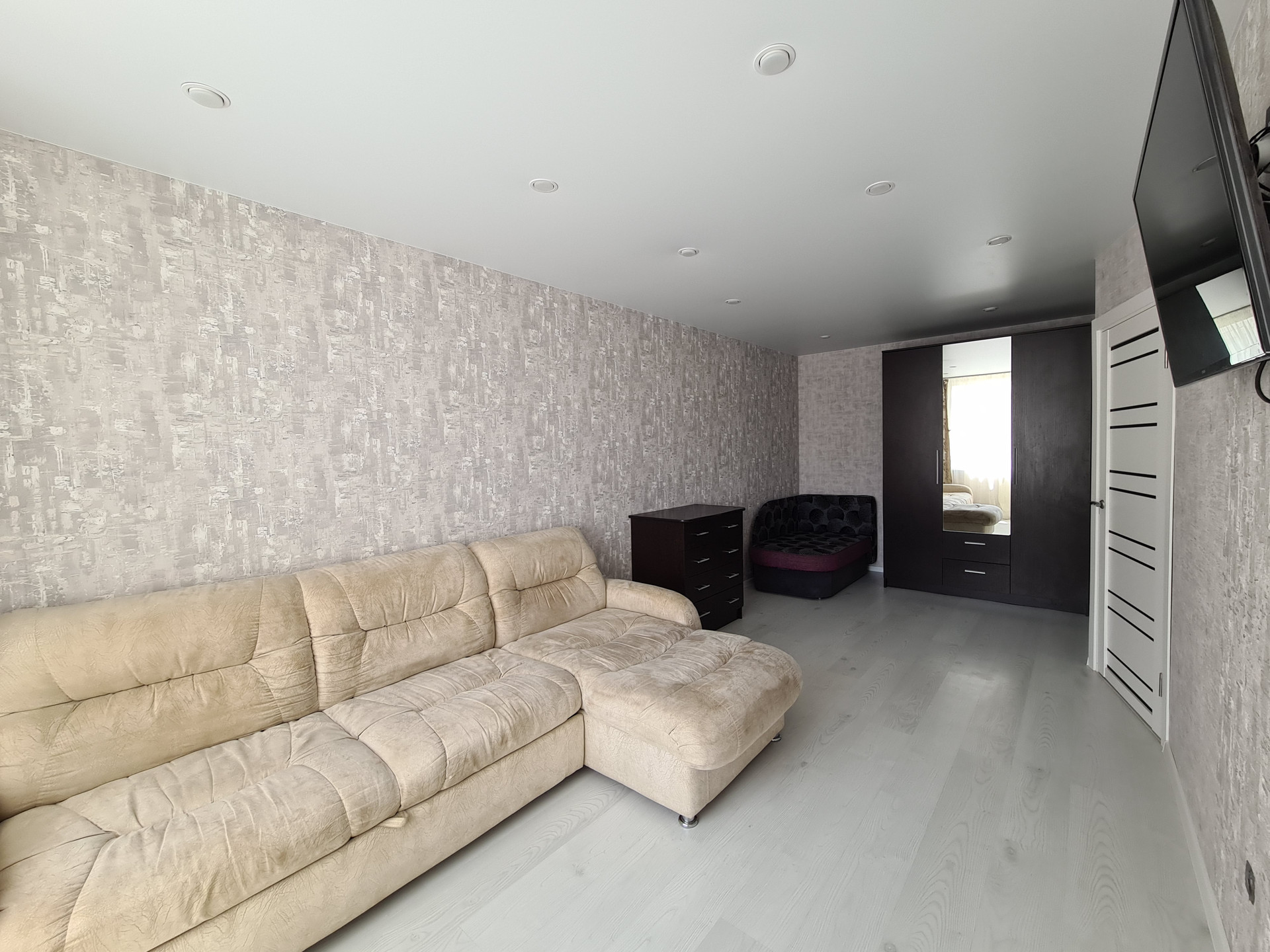 В квартире выполнен качественный ремонт, стены идеально ровные, потолок выполнен в стиле минимализм.