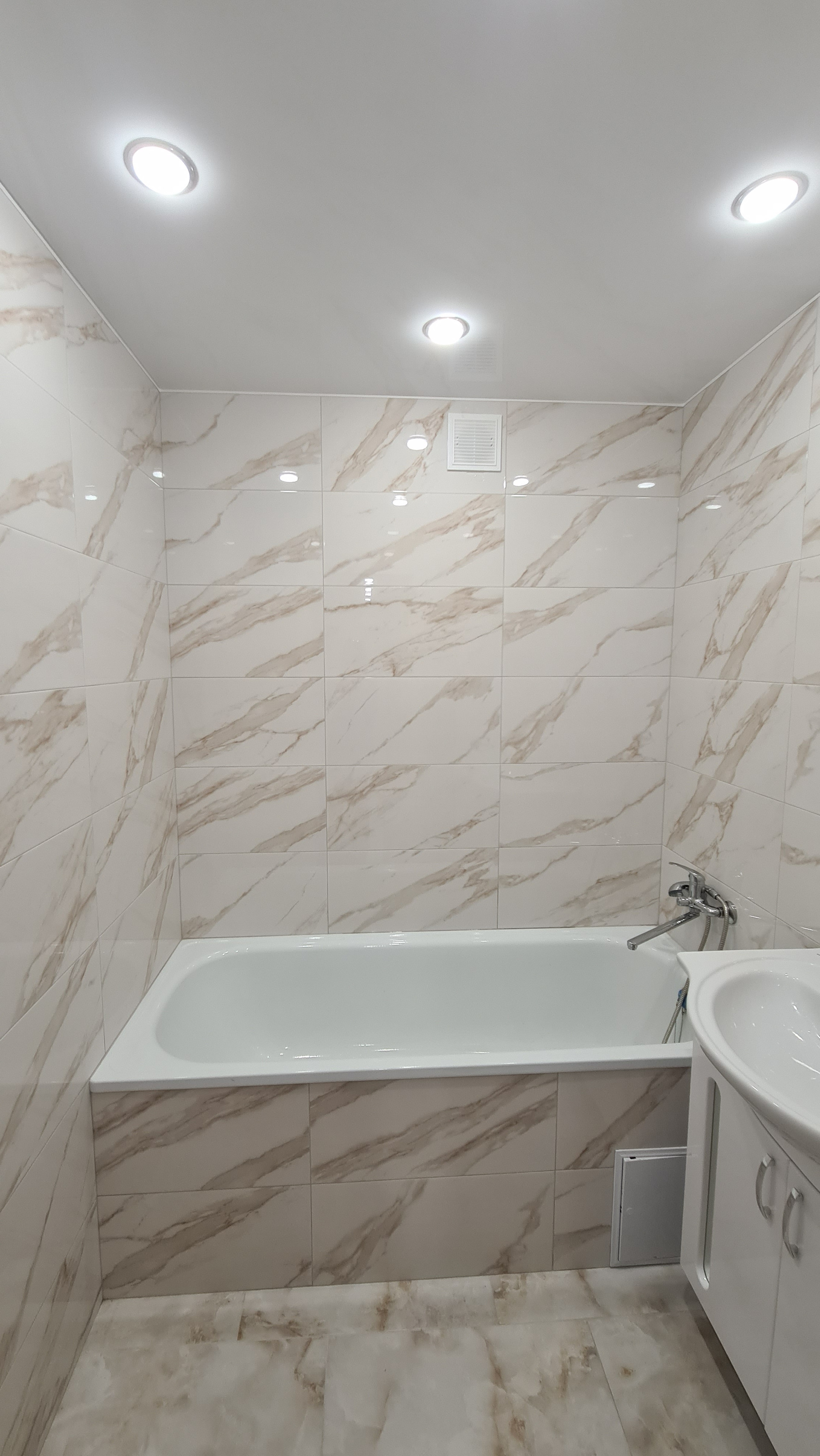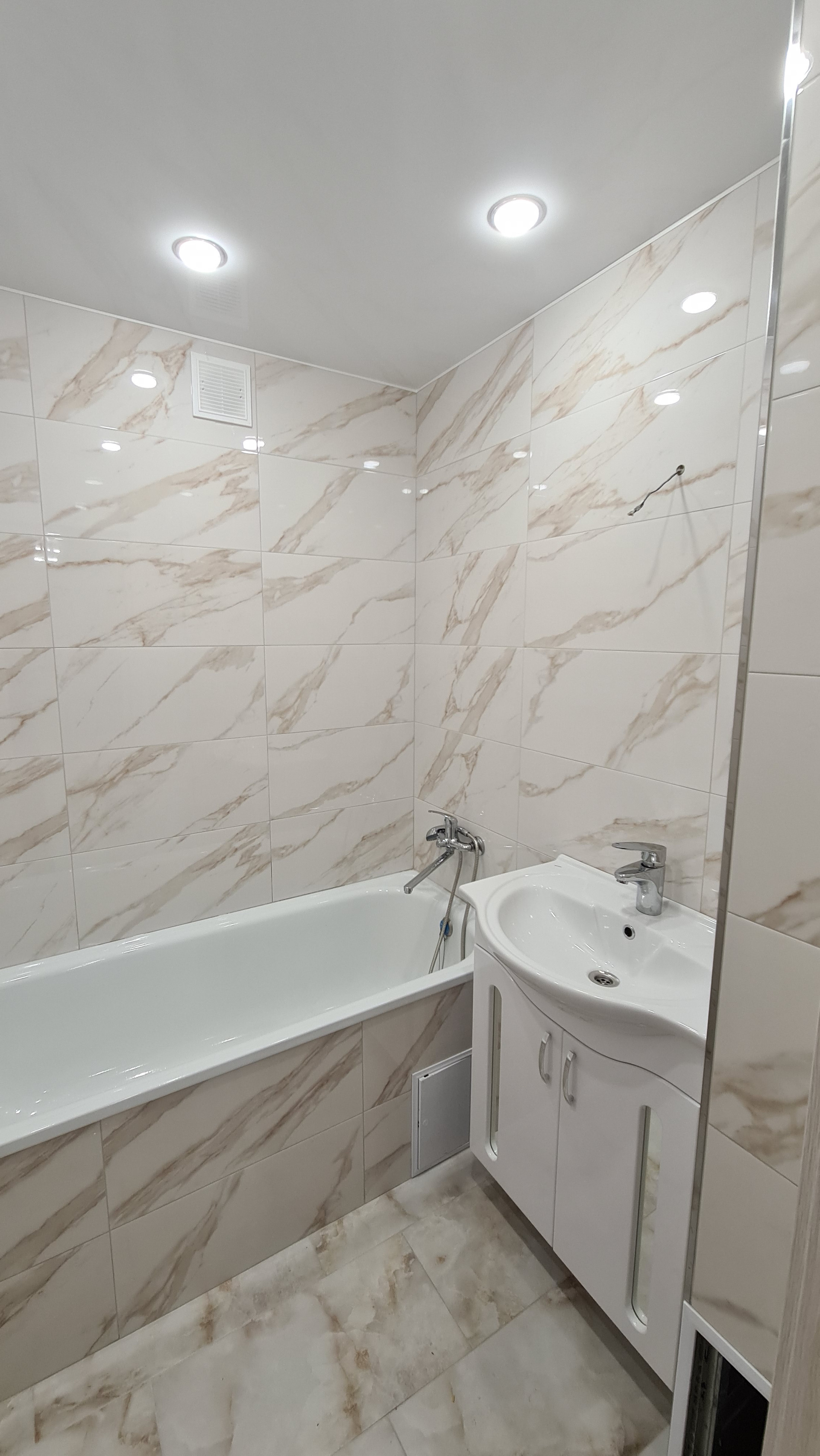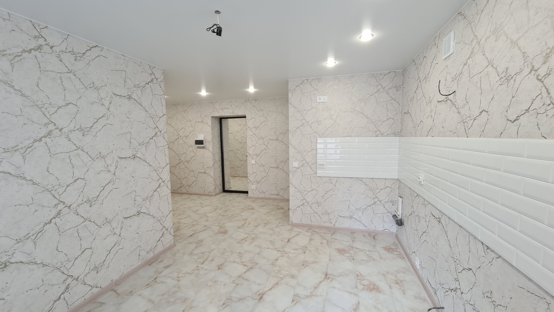 В комнатах на полу ламинат, на кухне и в коридоре керамогранит, белые натяжные пололки с точечным освещением.