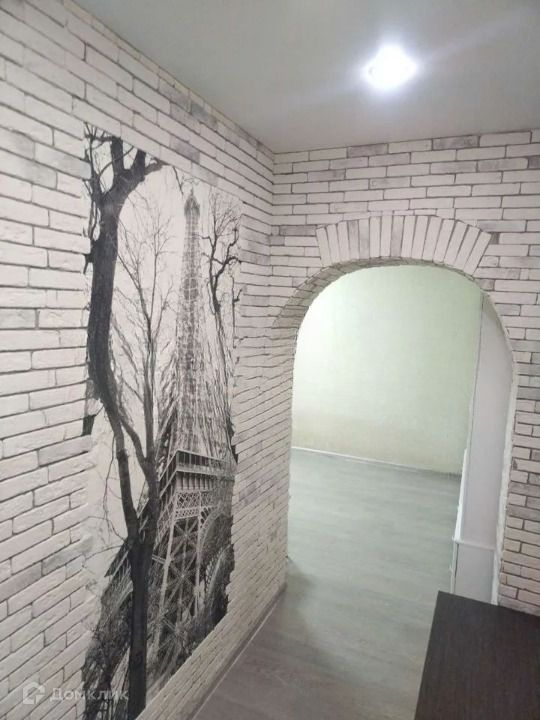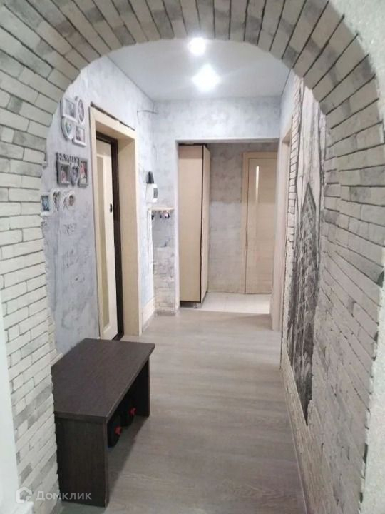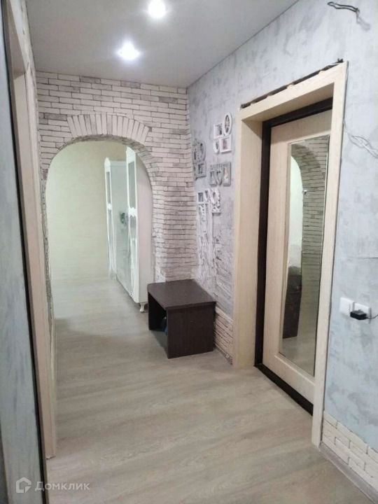 В коридоре- обои и декоративный камень. Качественная входная дверь Торекс. Точечные светильники.