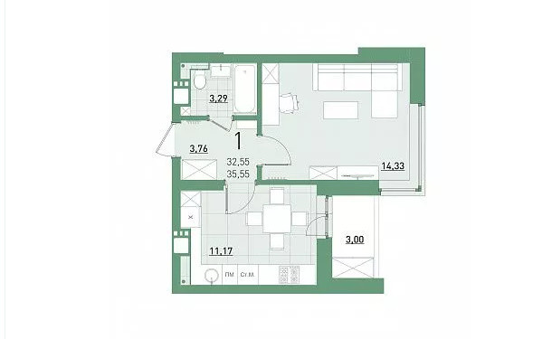 Общая площадь 32.5 м2