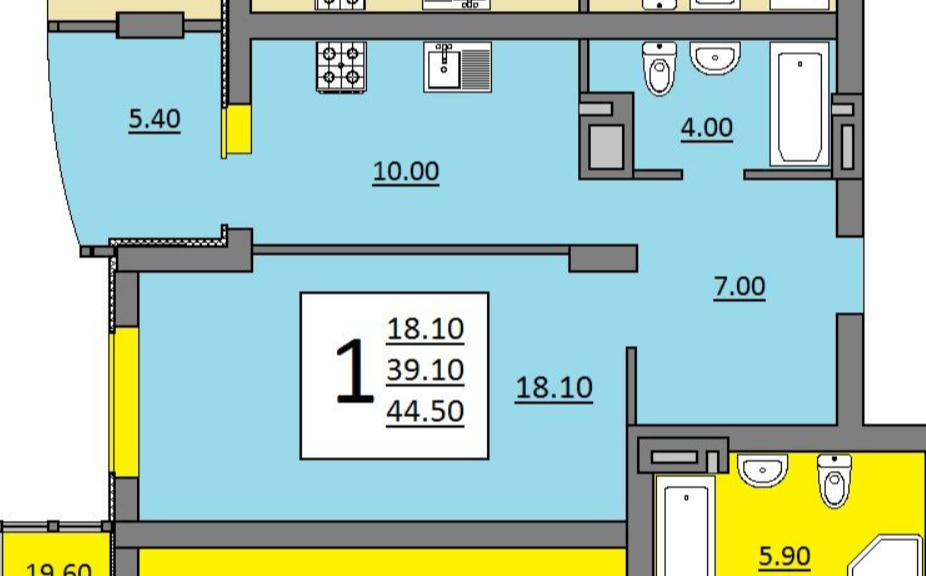 Общая площадь 44.5 м2