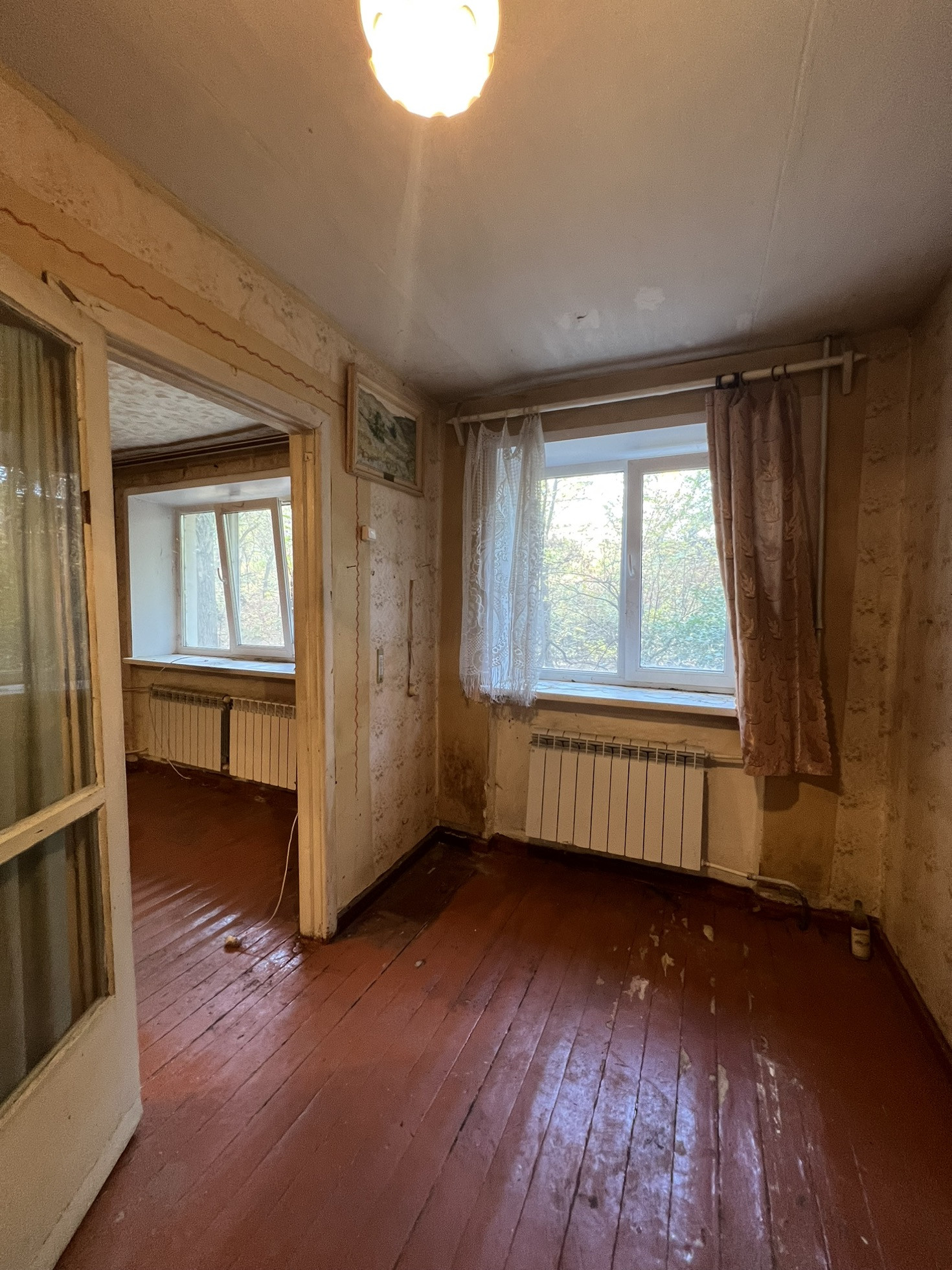 В квартире: две комнаты, гардеробная, совмещенный санузел, установлены пластиковые окна, газовая колонка. Квартира расположена на высоком 1-м этаже, в доме есть цокольный этаж. Своё ЖСК, ухоженный подъезд, тихий двор. Квартире требуется ремонт.