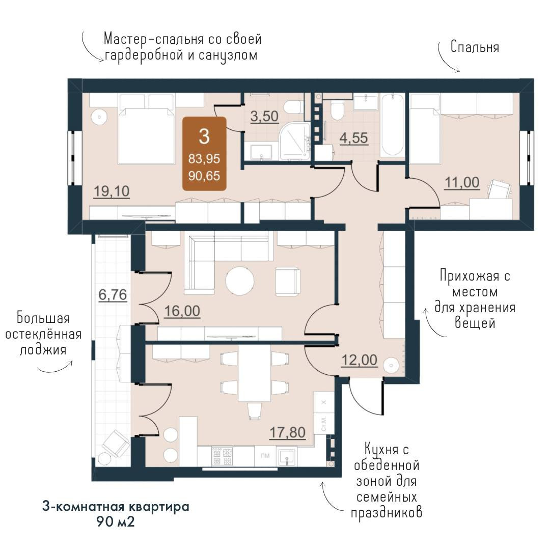 Общая площадь квартиры составляет 90,65 кв.м с учетом лоджии. В квартире предусмотрено 2 санузла 4,55+3,5 кв.м., один из которых в спальне, большая кухня 17,8 кв.м. с выходом на застекленную лоджию 6,76 кв.м, просторные комнаты 16+19,1+11 кв.м. и коридор 12,0 кв.м.!