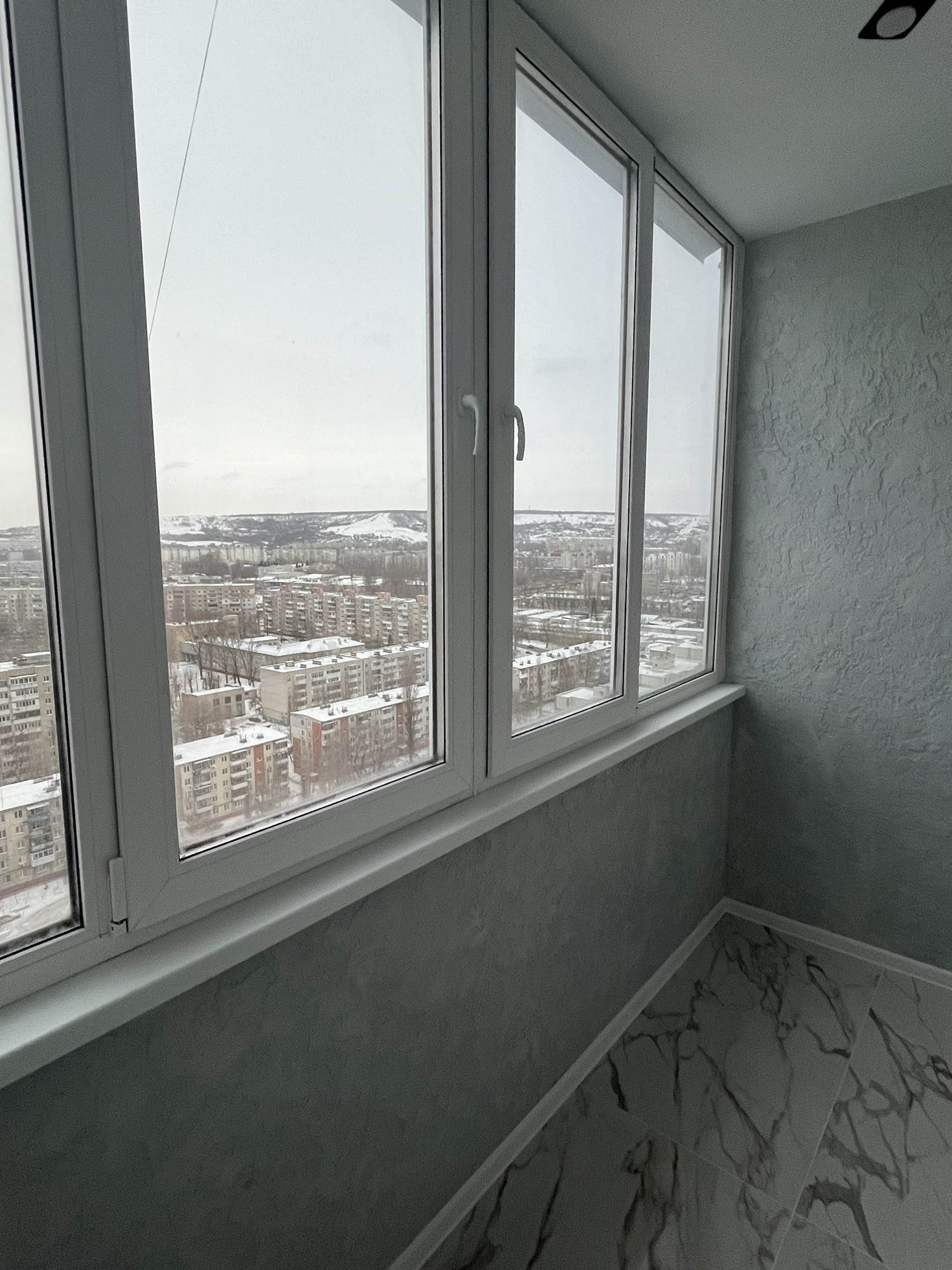 Лоджия застекленная пластиковым 2х камерным стеклопакетом с тонированными окнами, теплый пол ,положен керамогранит , на стенах декоративная штукатурка. Входная дверь торекс  с защитой и шумоизоляцией.