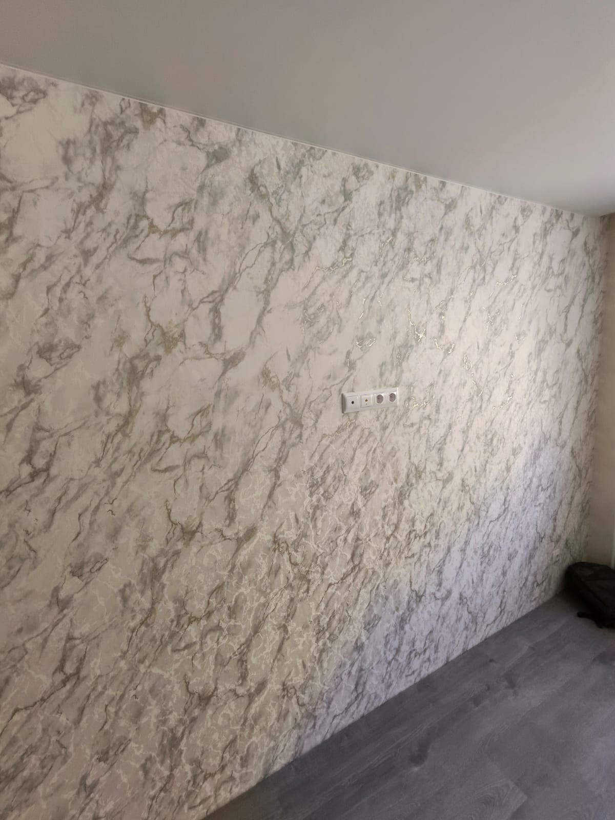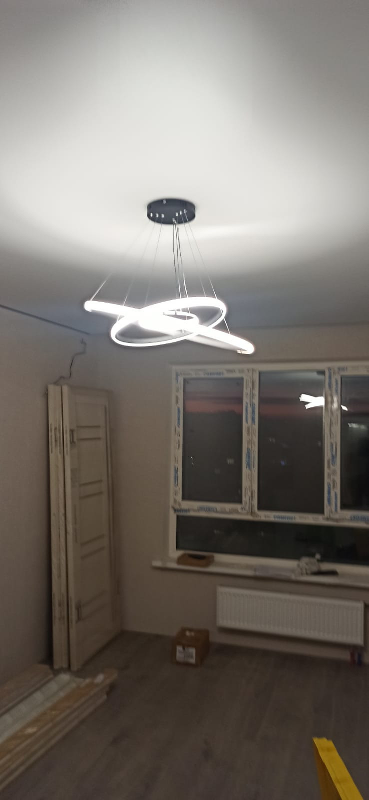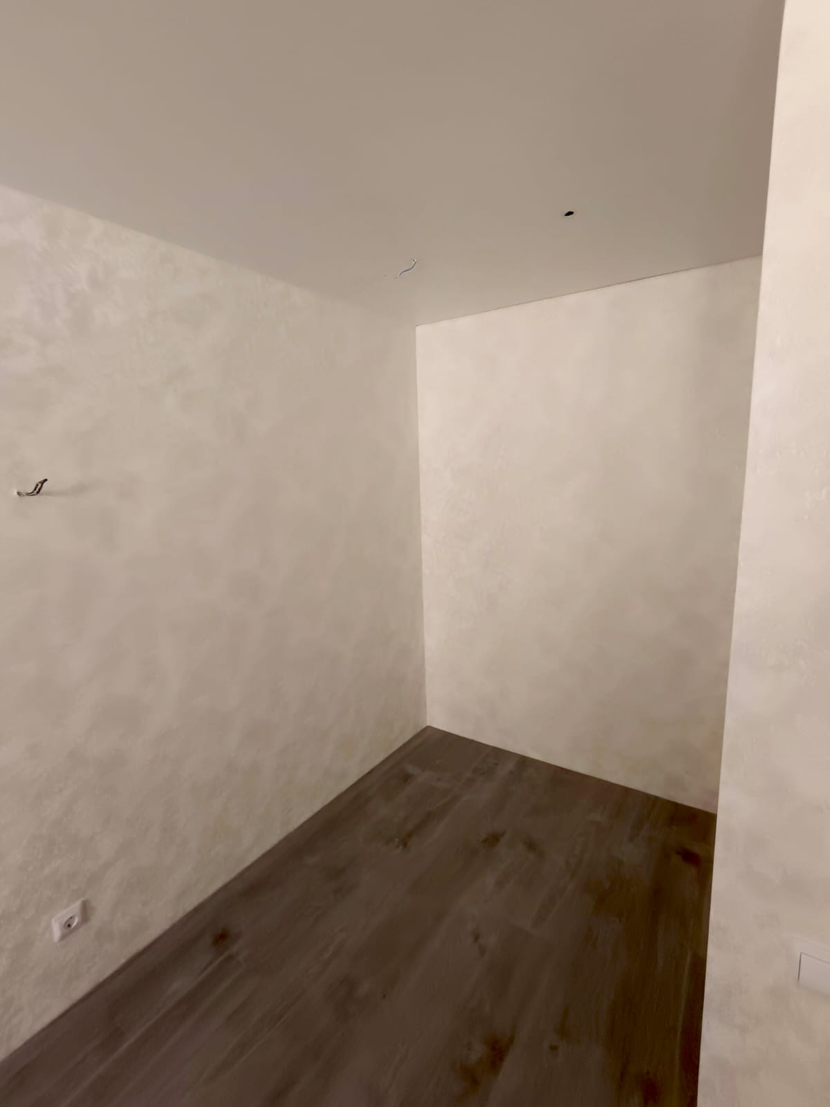 На потолке на кухне установлены трековые светильники. На кухне и в комнате система скрытых штор.