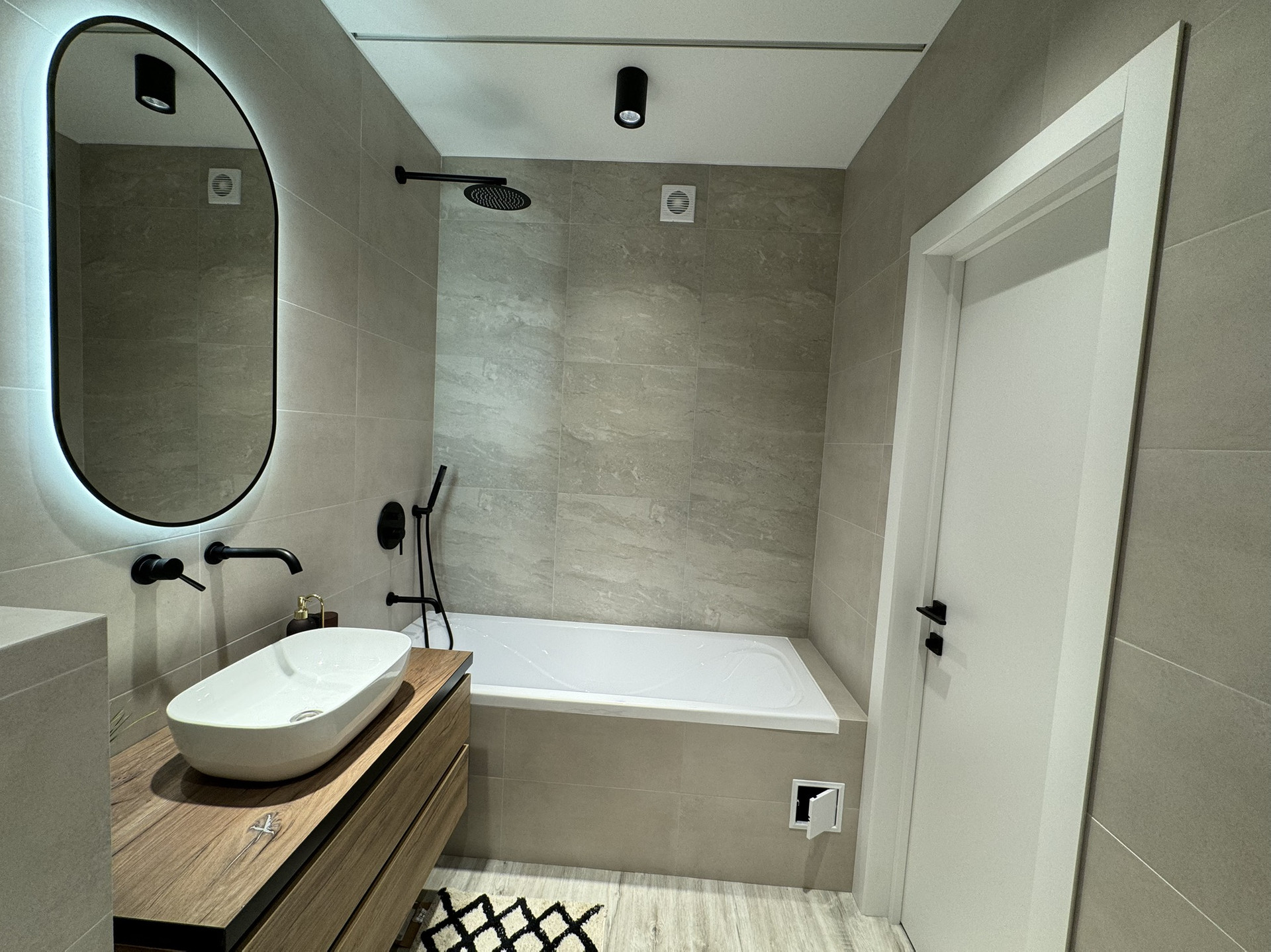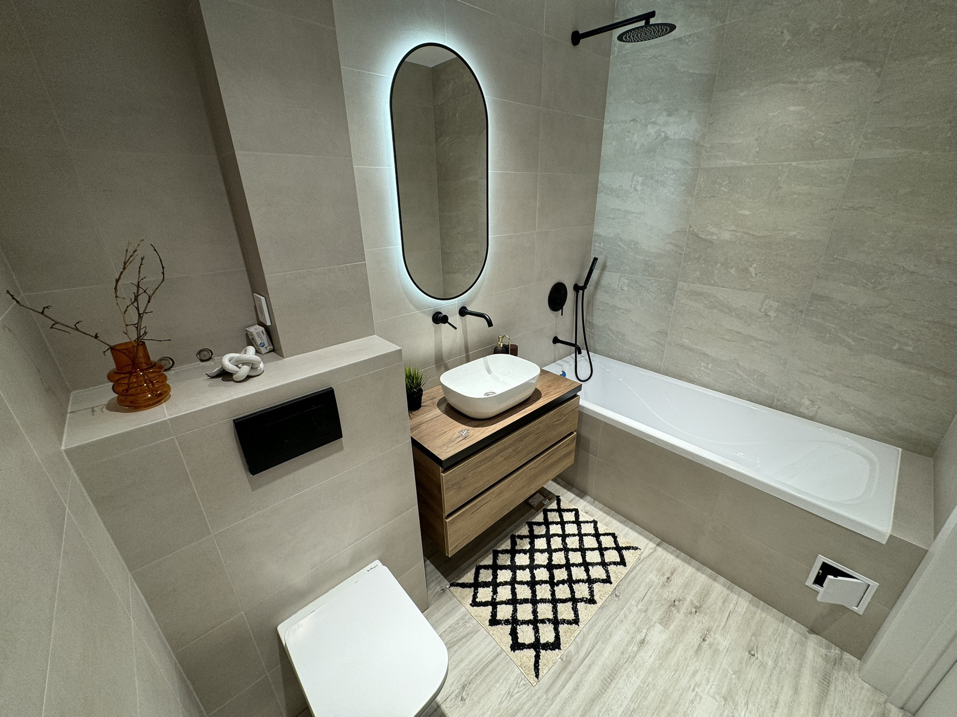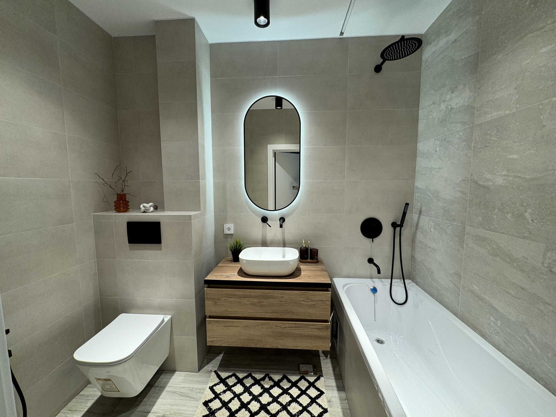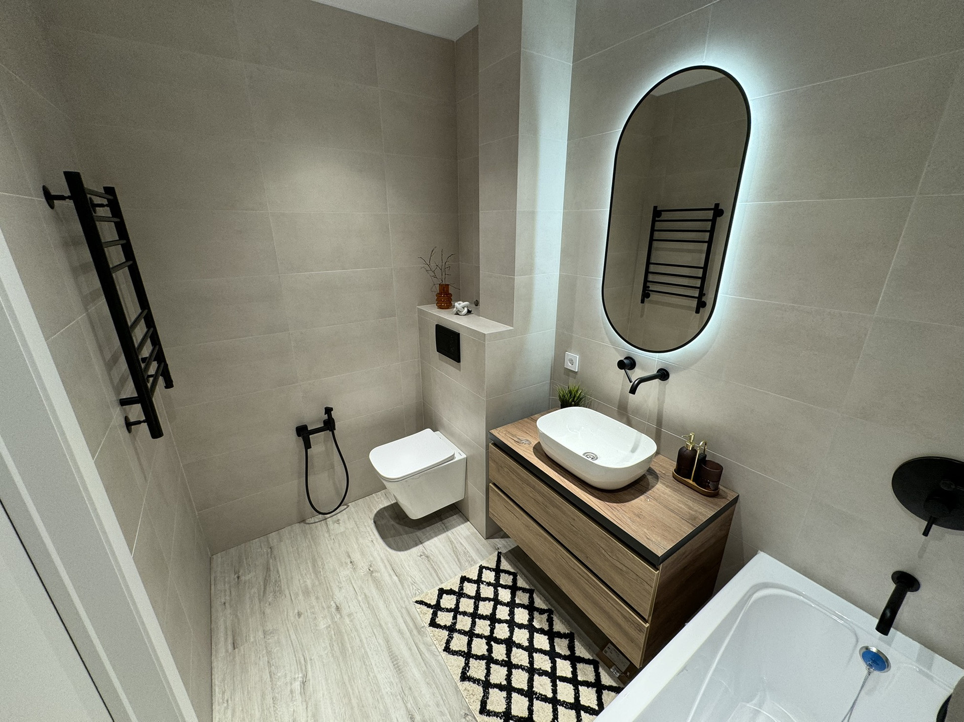 Санузел совмещенный с ванной, гигиеническим душем, подвесной унитаз, выводы под водонагреватель.