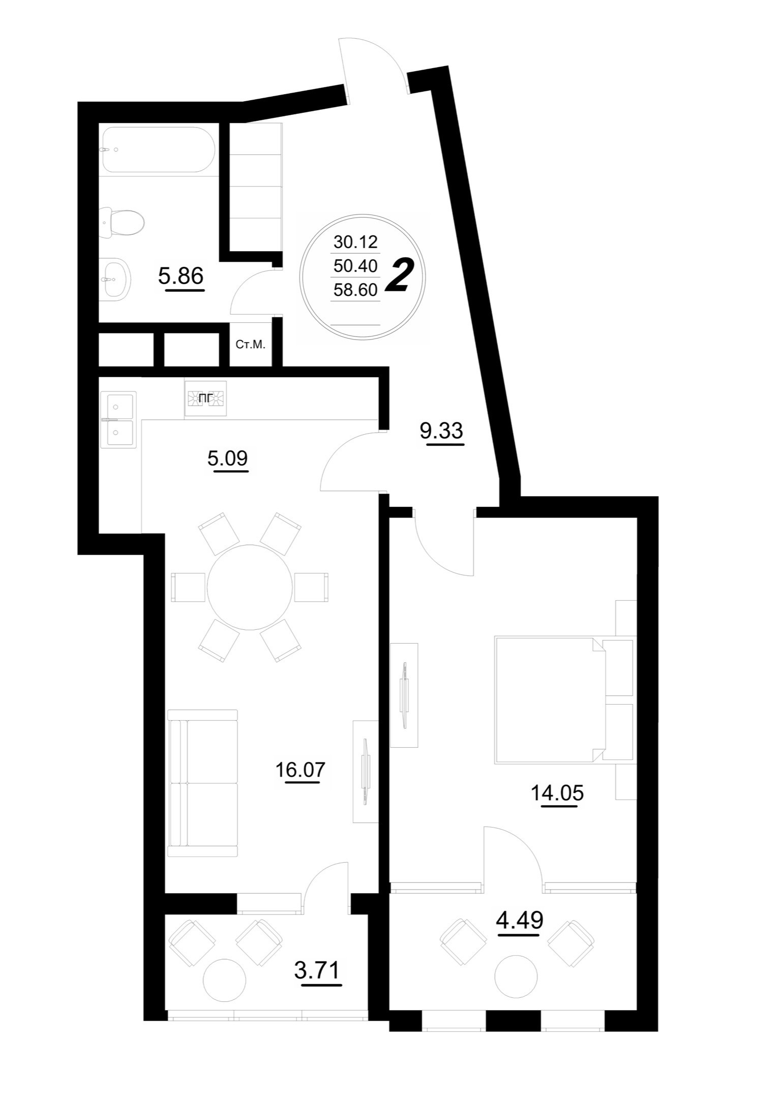 Общая площадь 58.6 м2