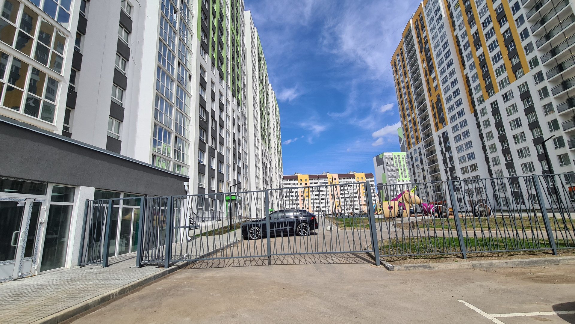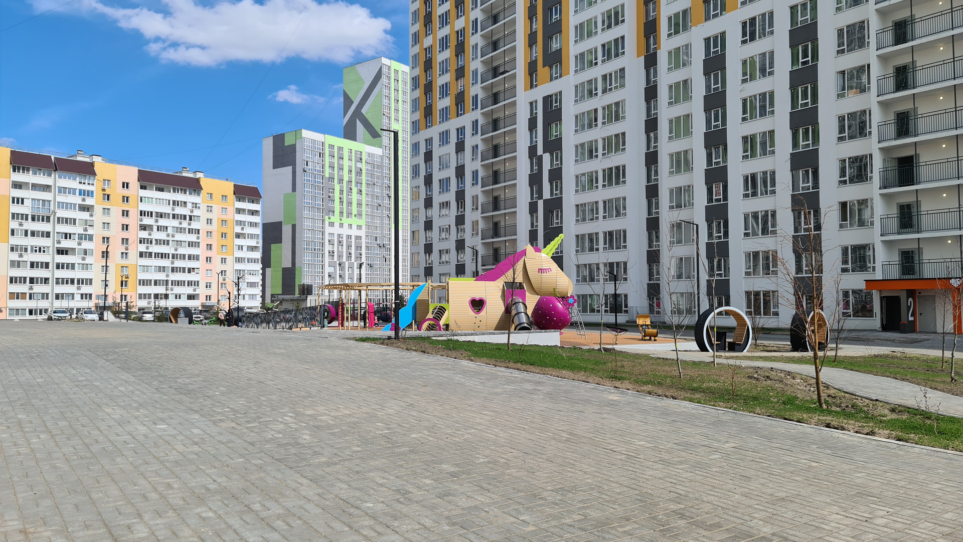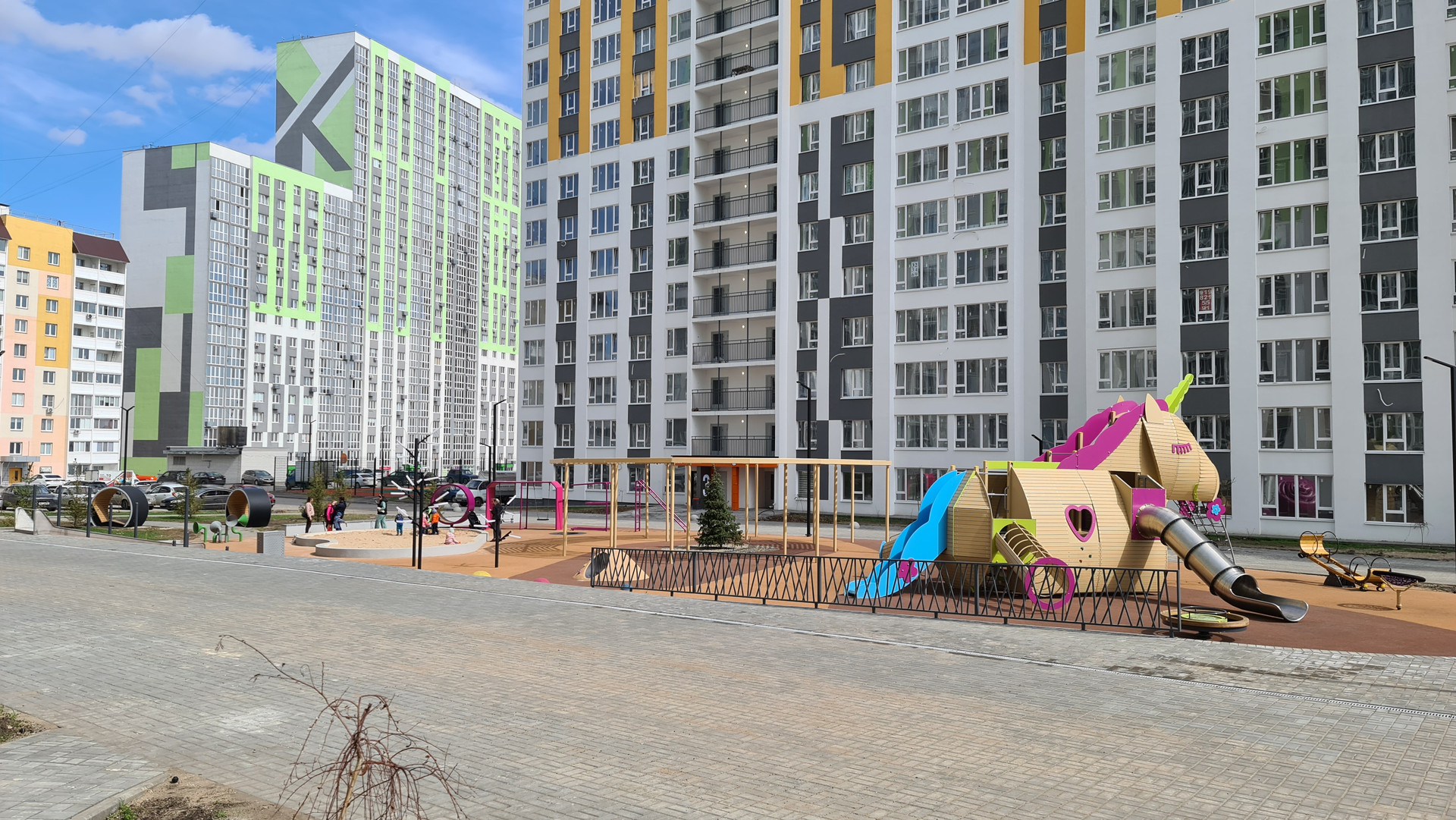 Придомовая территория разработана с учетом потребностей как взрослых, так и детей. Во дворе развивающая детская площадка для всех возрастов и спортивная площадка с безопасным покрытием.