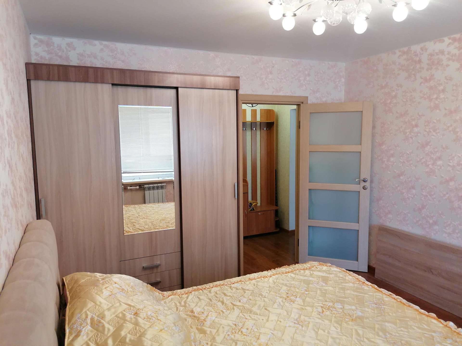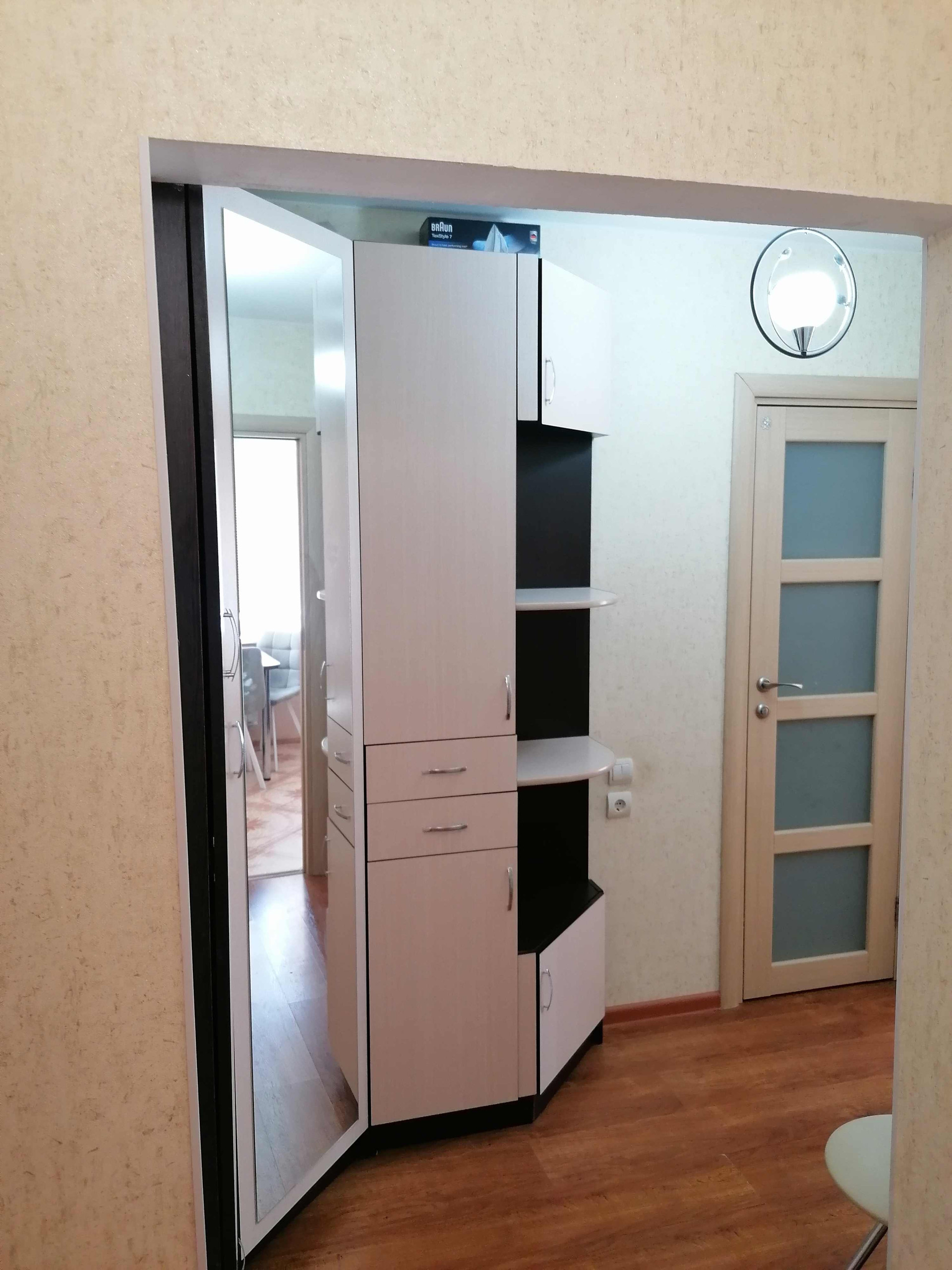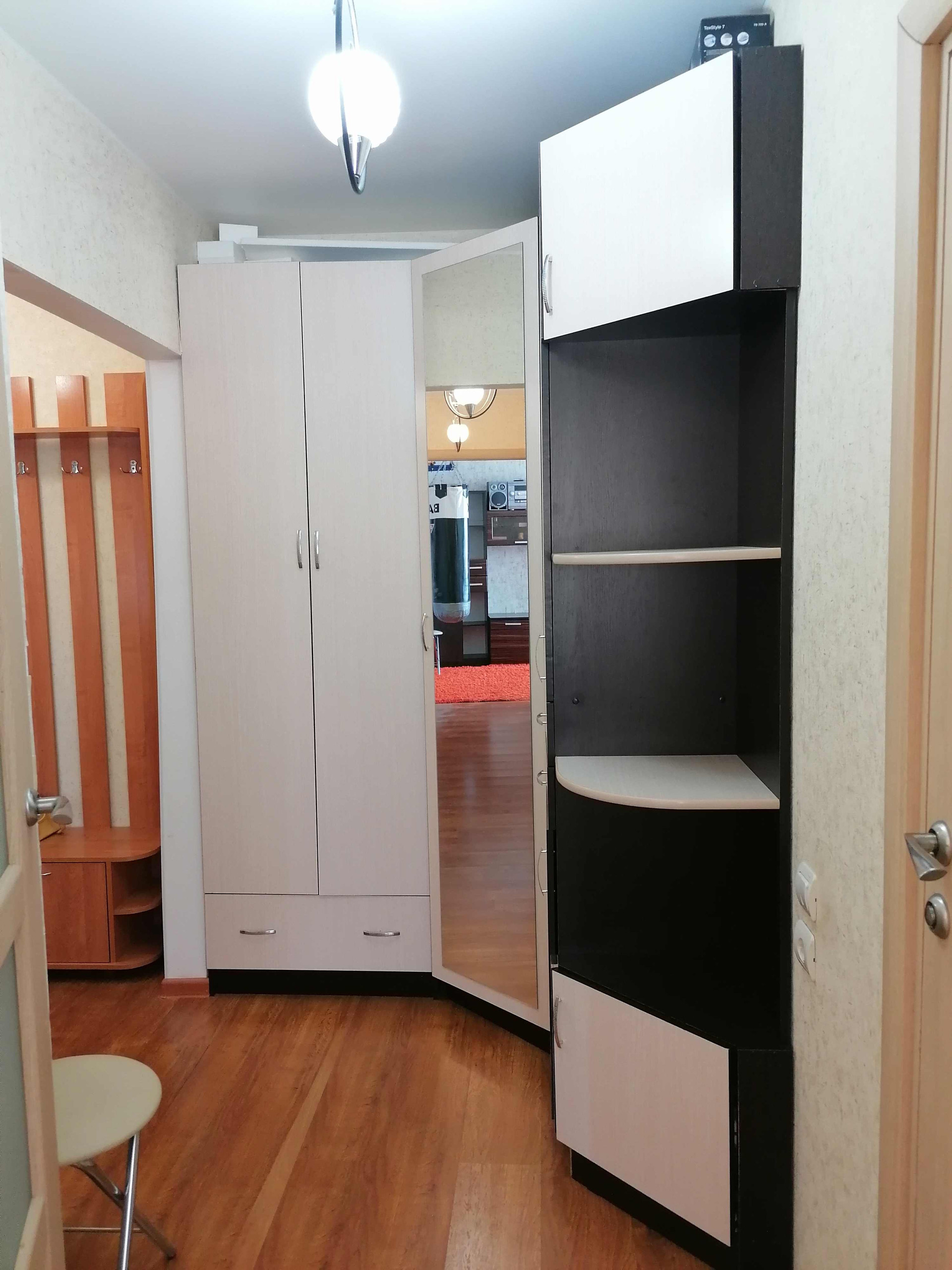 В спальне широкая кровать и вместительный шкаф, а также выход на застекленную лоджию. В коридоре практичный угловой шкаф.