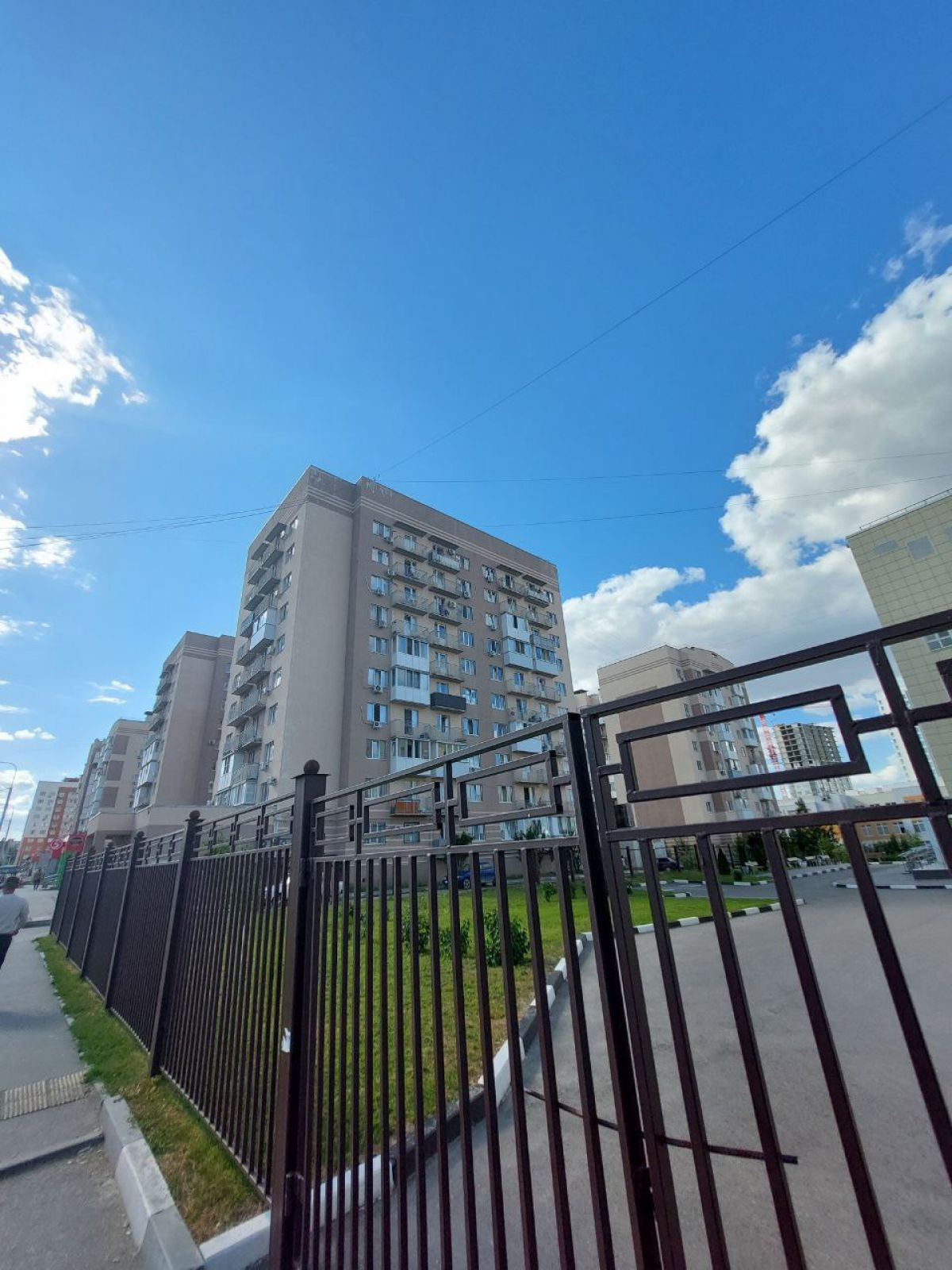 Ухоженная придомовая территория, на которой расположены детская площадка и парковка.