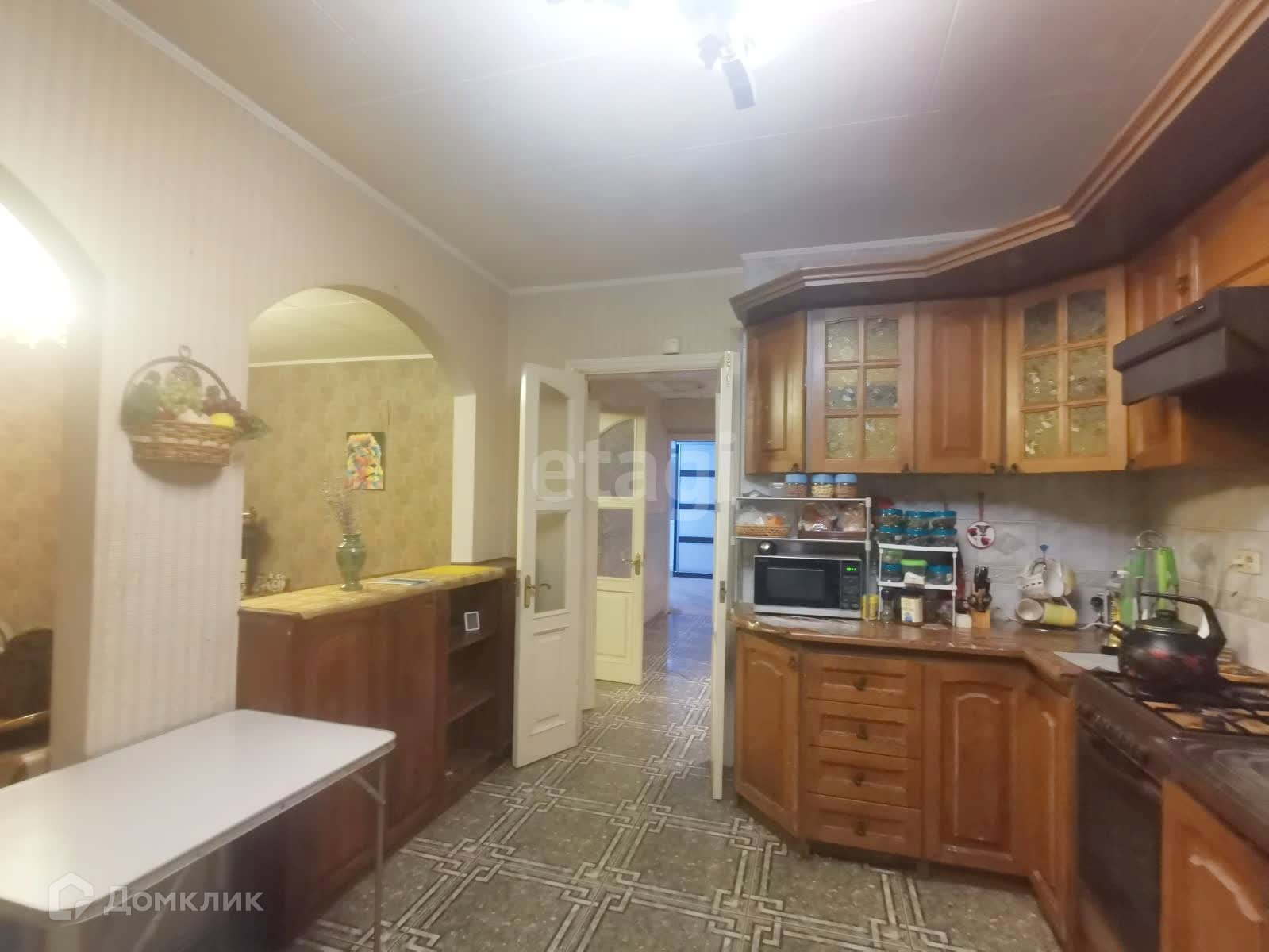 Уютная просторная кухня отделена от гостинной частичной перегородкой, что фактически даёт возможность использовать их как кухню-гостинную, или же как две разные комнаты.