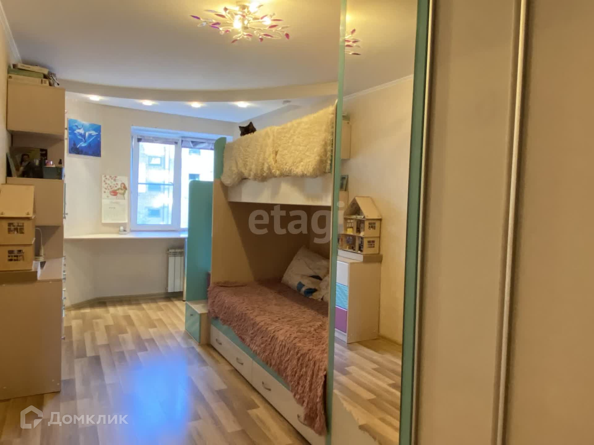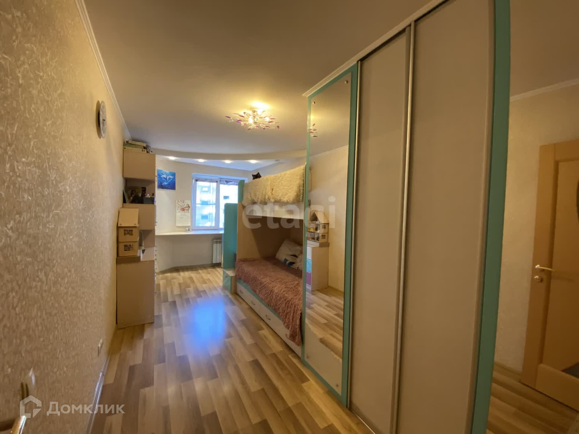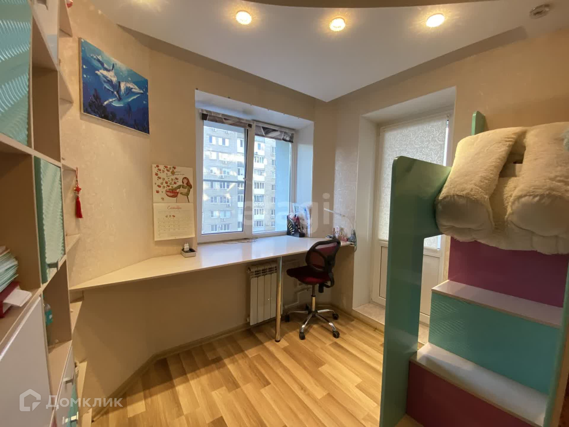 -2 спальня (детская)16 ,5 кв.м. имеет выход на застекленный балкон 4 кв.м. Здесь остаётся встроенный шкаф- гардеробная, двухъярусная кровать и шкафы с полками под книги.