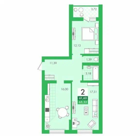 Квартира на 2 этаже, общая площадь 61,2 м2 плюс застекленная лоджия 4 м2, комнаты изолированные, кухня-гостиная 16 м2, санузел раздельный.